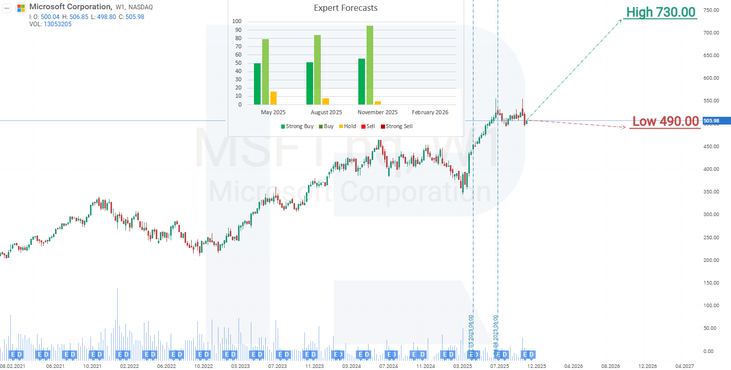 MSFT stock analysis and forecast for 2025Forecasts presented in this section only reflect the author’s private opinion and should not be considered as guidance for trading. RoboForex bears no responsibility for trading results based on trading recommendations described in these analytical reviews.