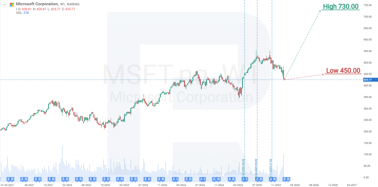 Expert forecasts for MSFT stock for 2026On the weekly chart, Microsoft Corporation shares are trading in an ascending channel and approaching the trendline, which serves as support. In October 2025, MSFT shares reached the upper line of the ascending channel at 550 USD and began to correct, falling 22% by February 2026. The proximity to the trendline signals a potential end to the correction and a resumption of the price rise within the upward trend. Based on the current performance of Microsoft Corporation shares, the possible price scenarios for 2025 are as follows: