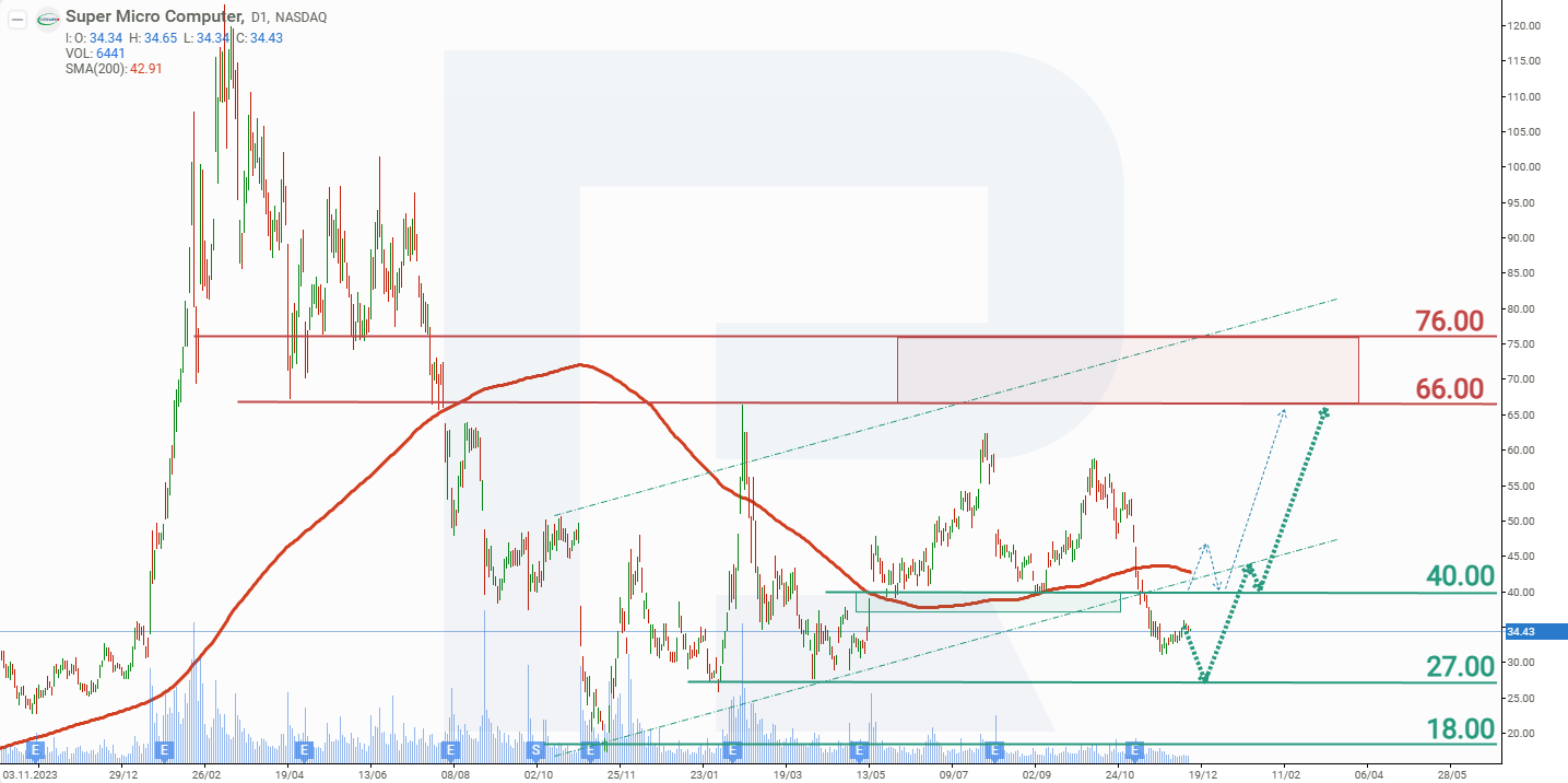The alternative forecast for Super Micro Computer stock should be considered if the price breaks through resistance near 40 USD. In this scenario, the stock could advance towards 66 USD, and if that level is breached, it could continue climbing towards the next target at 76 USD.
