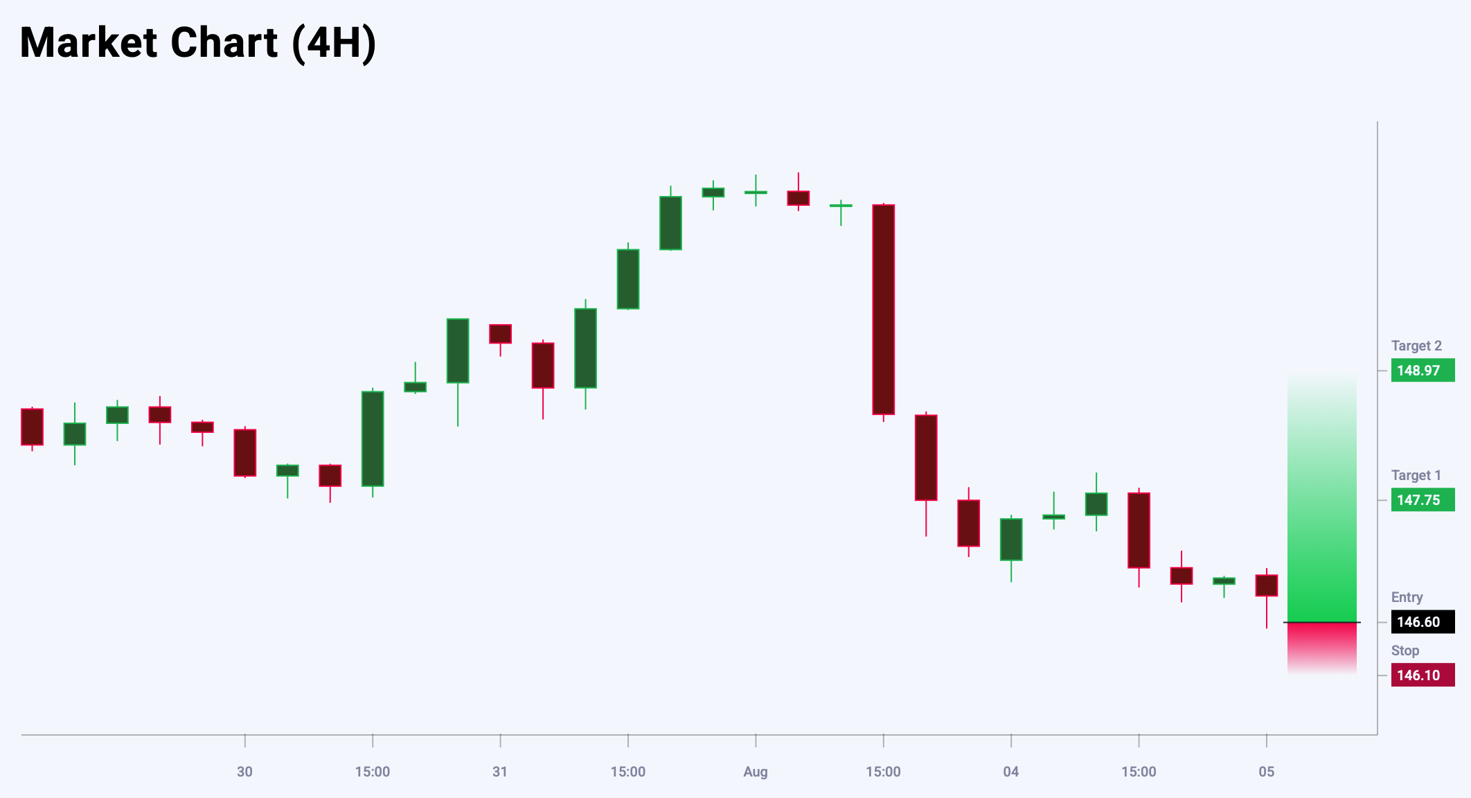 The USDJPY currency pair has corrected from its intraday lows, signalling that the upward impulse remains intact at the start of European trading. The intraday trend is shaping between the 146.60 support level and the 147.75 resistance level. The pair is in oversold territory, which increases the likelihood of renewed growth. The baseline scenario suggests buying on pullbacks, using short-term dips to open long positions. The USDJPY trade idea for today suggests placing a pending Buy Limit order.