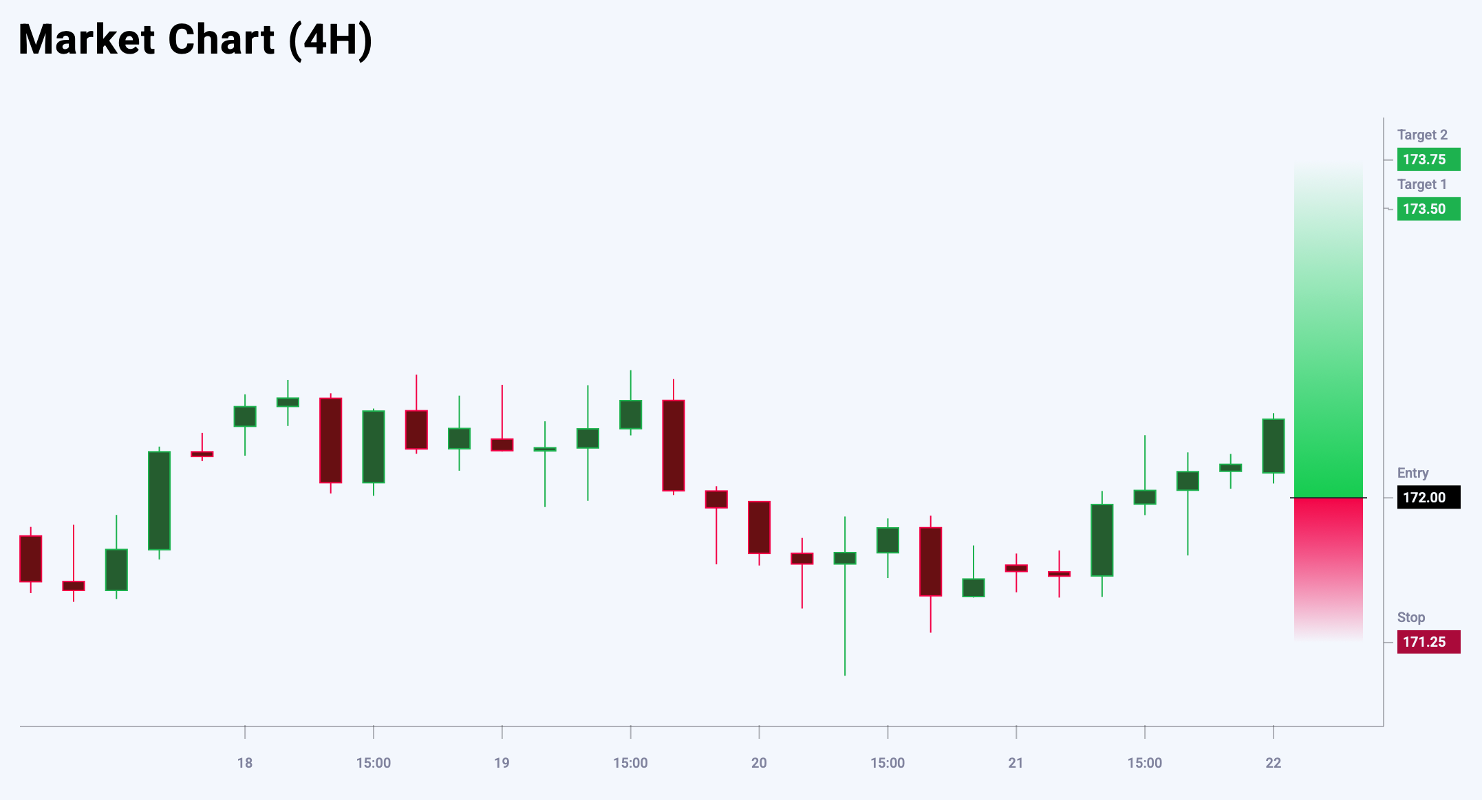 Market sentiment for EURJPY shows a slight bullish advantage – 51% vs 49%. The risk-to-reward ratio exceeds 1:2. The potential profit is 150 pips at the first take-profit level and 175 pips at the second, while possible losses are limited to 75 pips.