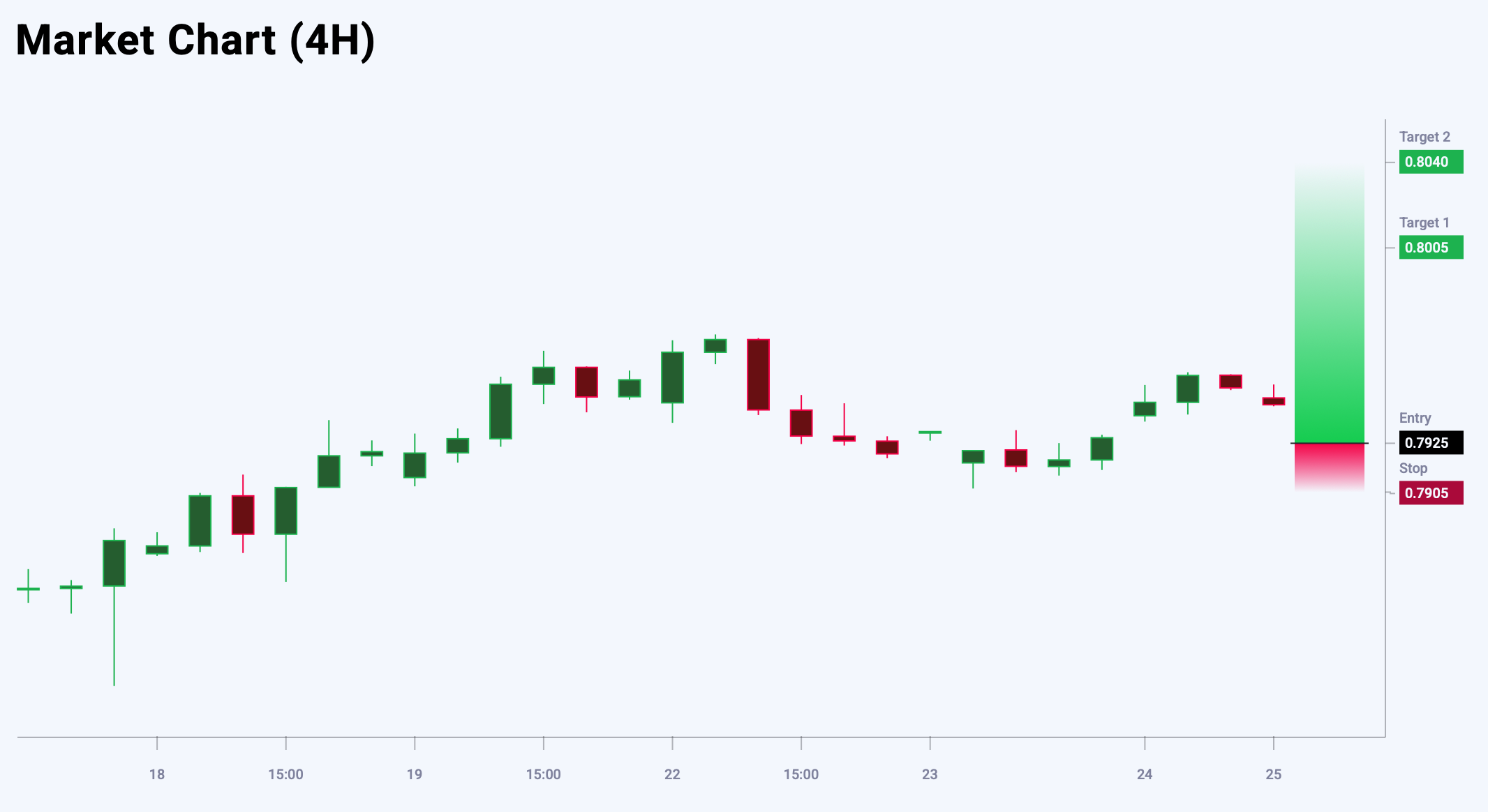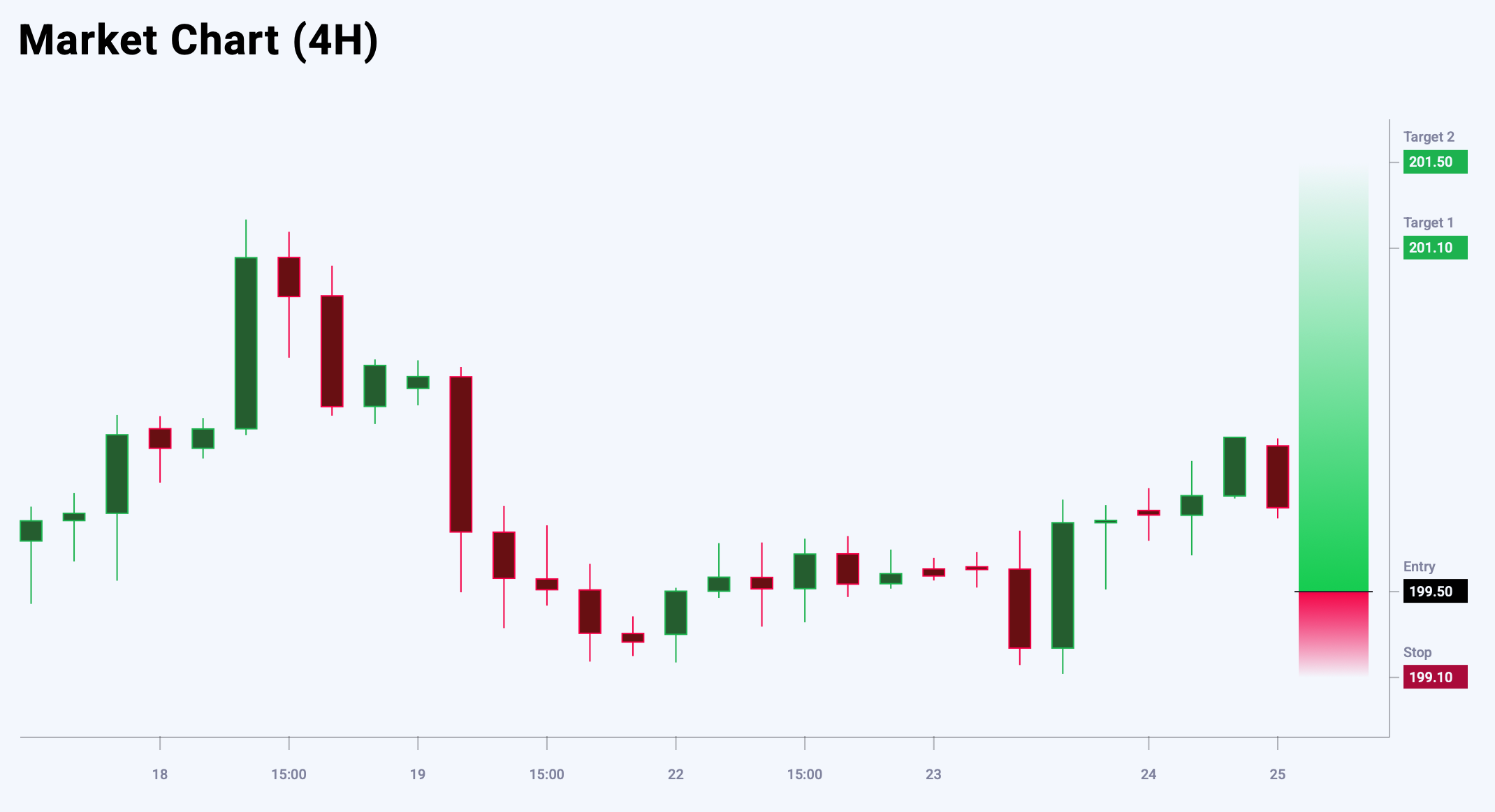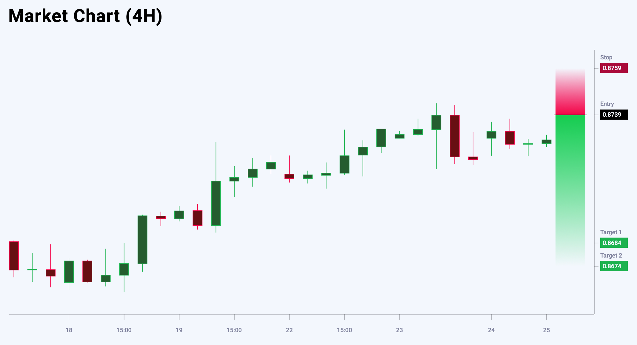 Market sentiment for EURGBP shows a bullish tilt – 51% vs 49%. The risk-to-reward ratio is above 1:3. Potential profit is 45 pips at the first take-profit target and 55 pips at the second, while possible losses are capped at 15 pips.