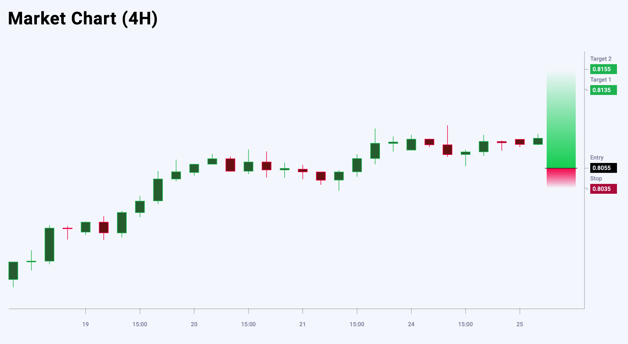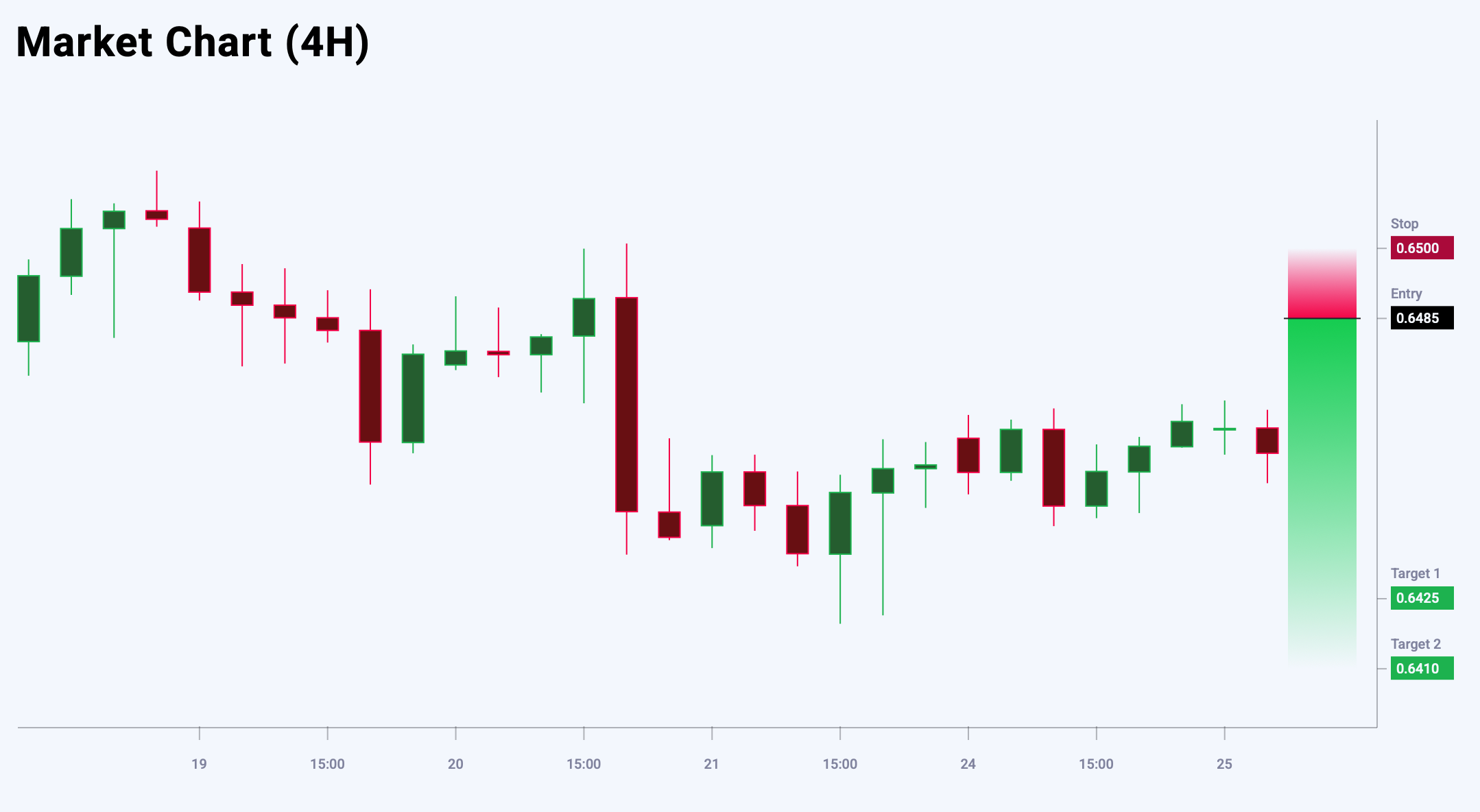 Market sentiment for AUDUSD reflects a bearish bias – 58% vs 42%. The risk-to-reward ratio is 1:4. Potential profit is 100 pips at the first take-profit target and 80 pips at the second, with possible losses capped at 20 pips.