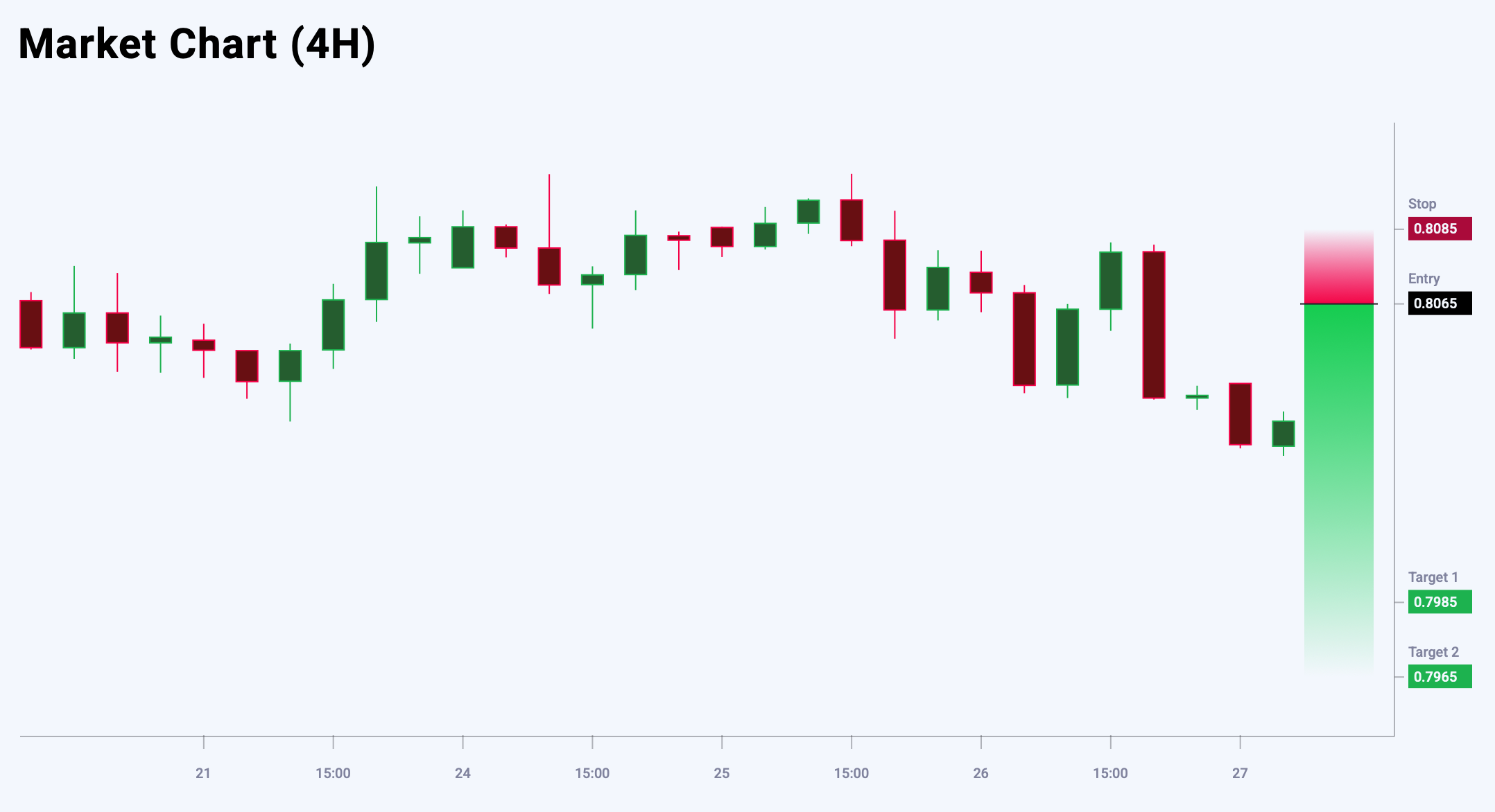 Market sentiment for USDCHF shows a bearish bias – 56% vs 44%. The risk-to-reward ratio is 1:5. Potential profit is 80 pips at the first take-profit target and 100 pips at the second, with possible losses capped at 20 pips.