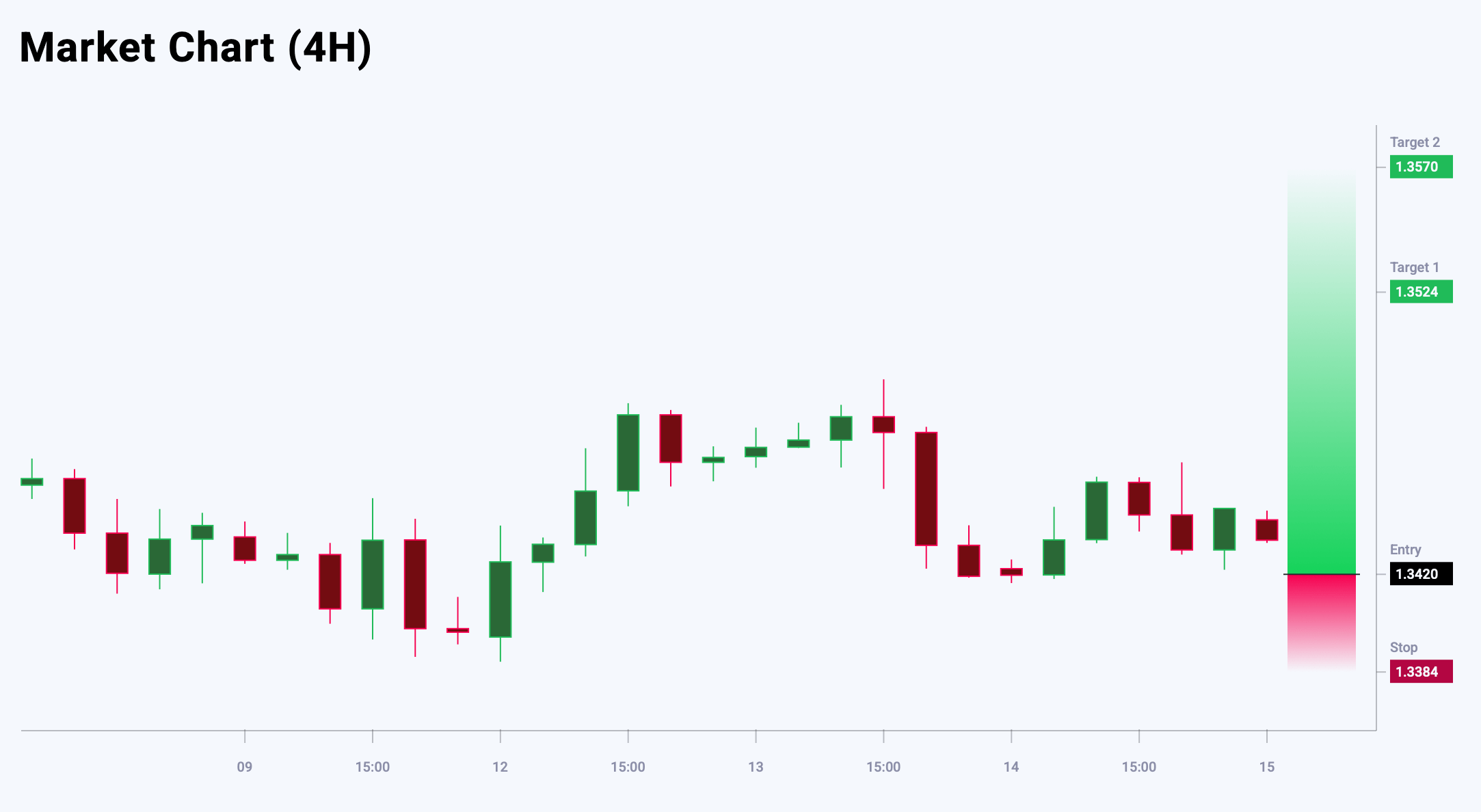 The GBPUSD currency pair is showing signs of a potential reversal bottom, while the medium-term bias remains bullish. Short-term price declines are expected to be limited, with the nearest support level located at 1.3420. The preferred strategy remains buying on pullbacks, viewing temporary price declines as opportunities to enter long positions. Today’s GBPUSD trading idea suggests placing a pending Buy Limit order.