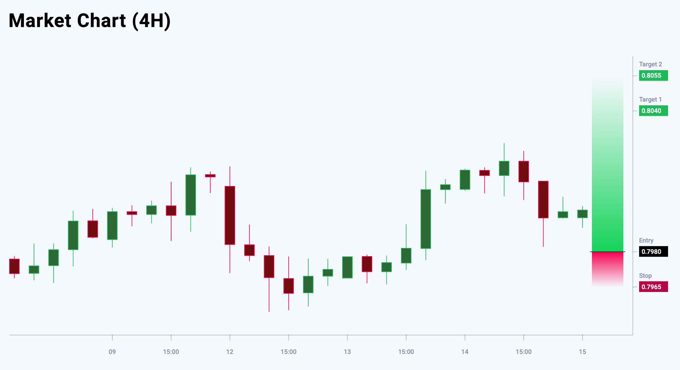 Market sentiment for USDCHF shows a bullish bias – 51% versus 49%. The risk-to-reward ratio is 1:4. Potential profit is 60 pips at the first take-profit level and 75 pips at the second, with possible losses limited to 15 pips.