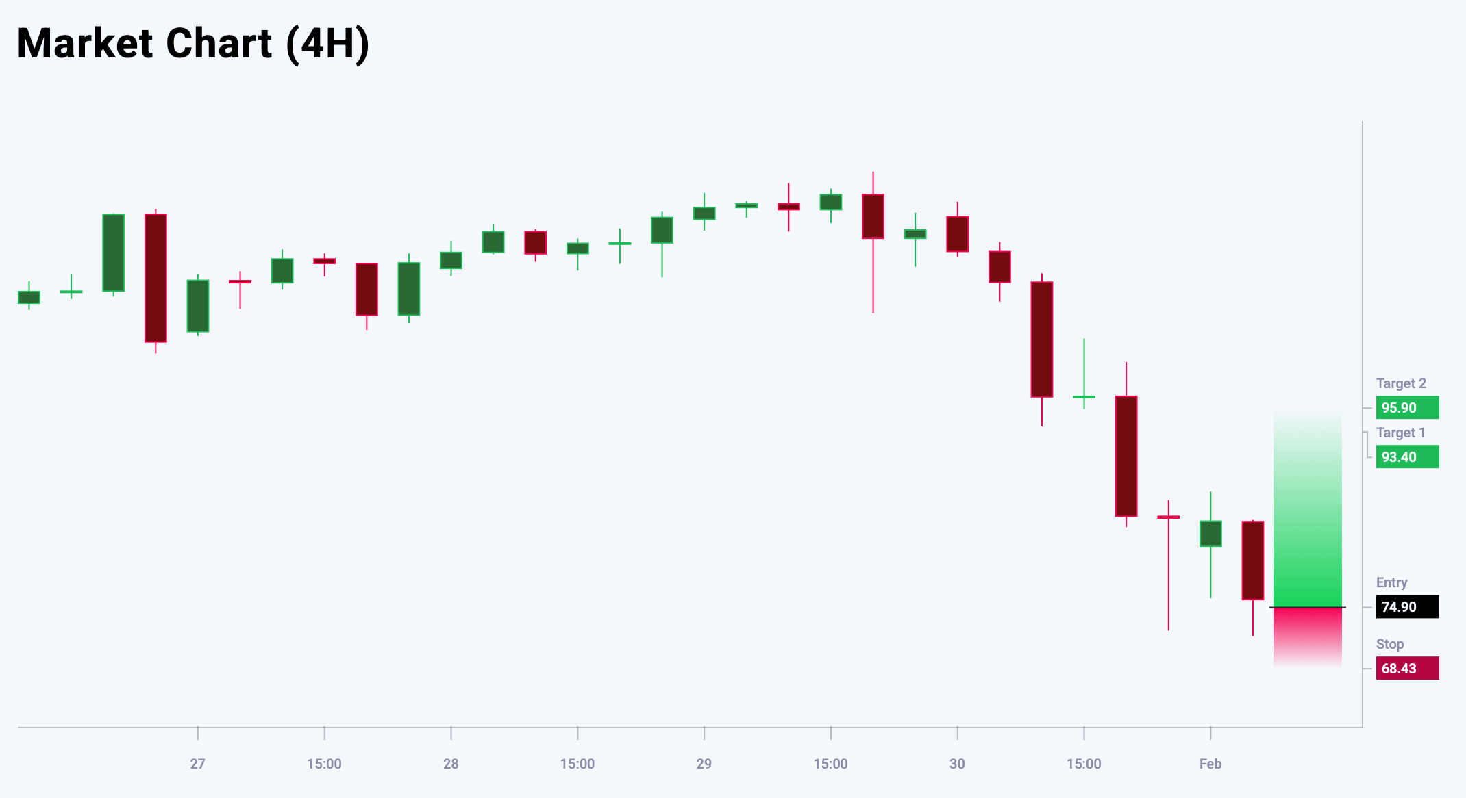 On the XAGUSD chart, prices are forming a short-term bottom. A reversal candlestick combination has emerged, which additionally indicates a possible price reversal. This supports a short-term bullish market bias and is considered an opportunity to open long positions. The key support level is located at 74.90. The strategy focuses on buying on price declines. The XAGUSD trade idea for today suggests placing a pending Buy Limit order.
