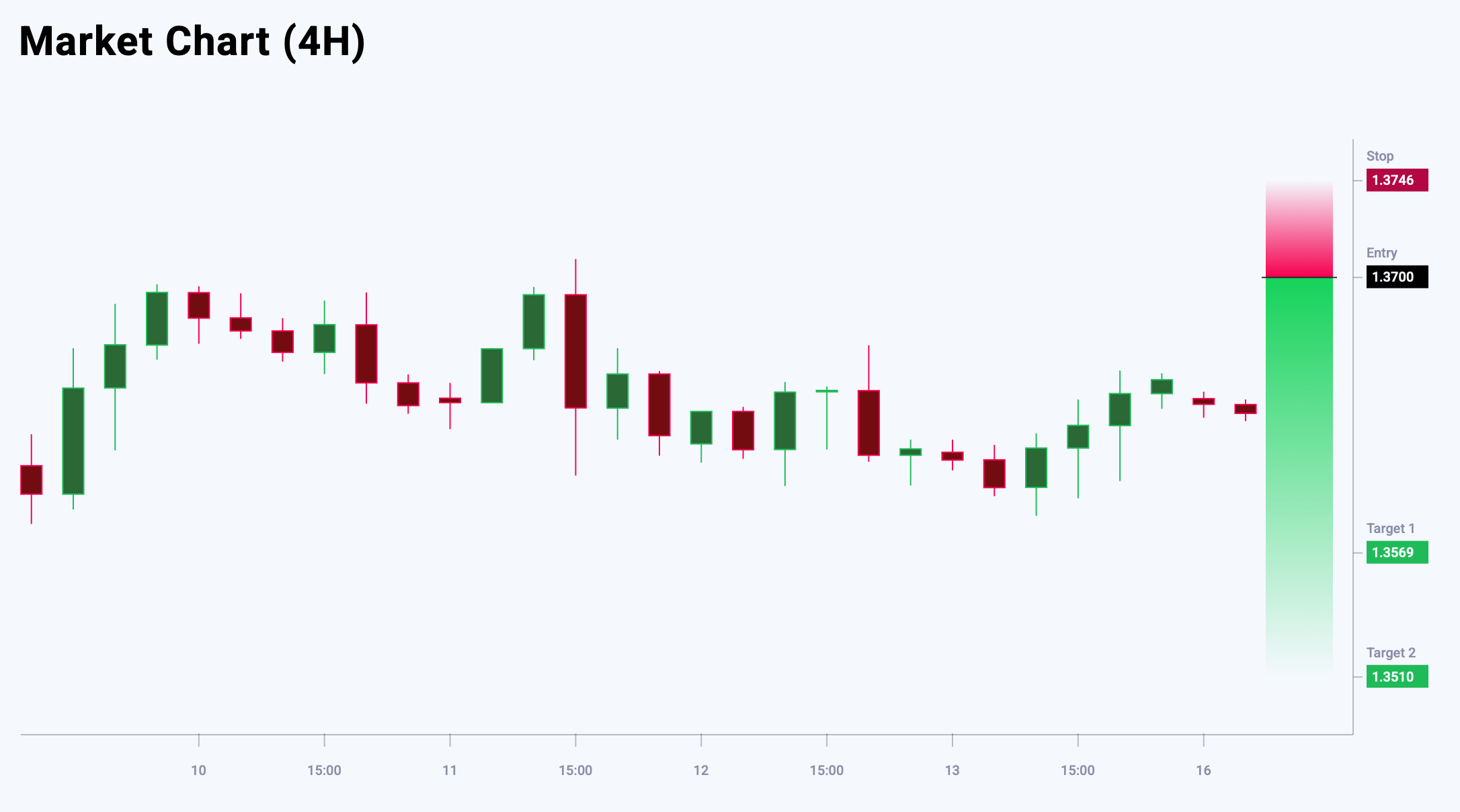 Market sentiment for GBPUSD shows a bearish bias at 53% versus 47%. The risk-to-reward ratio exceeds 1:4. The potential profit is 131 pips at the first take-profit level and 190 pips at the second, with possible losses limited to 46 pips.