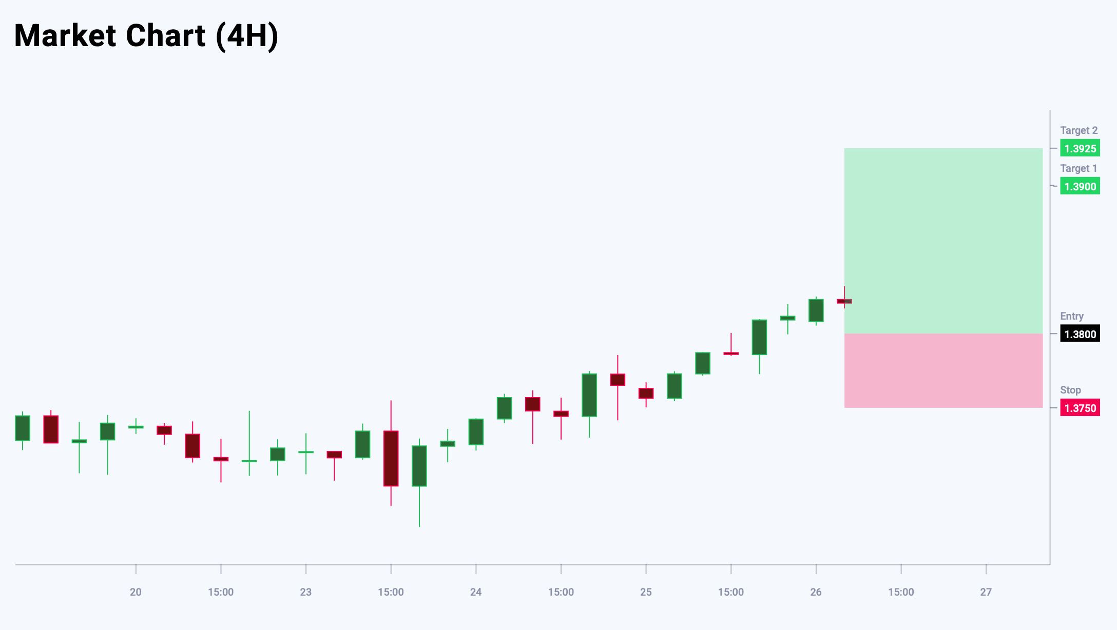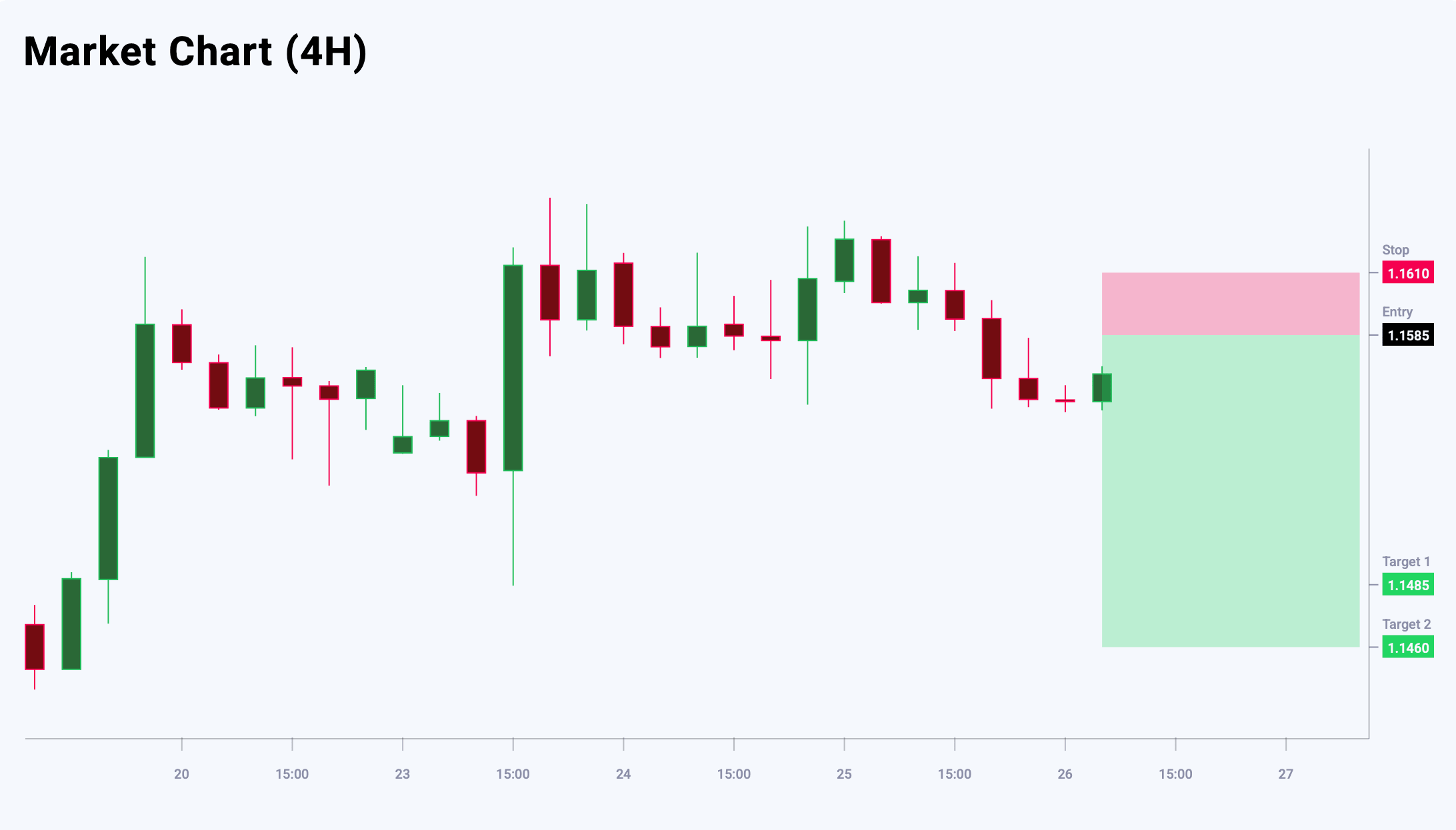 The news background for EURUSD shows prevailing bearish expectations – 60% vs 40%. The risk-to-reward ratio is 1:5. The potential profit is 100 pips at the first take-profit level and 125 pips at the second, with possible losses capped at 25 pips.
