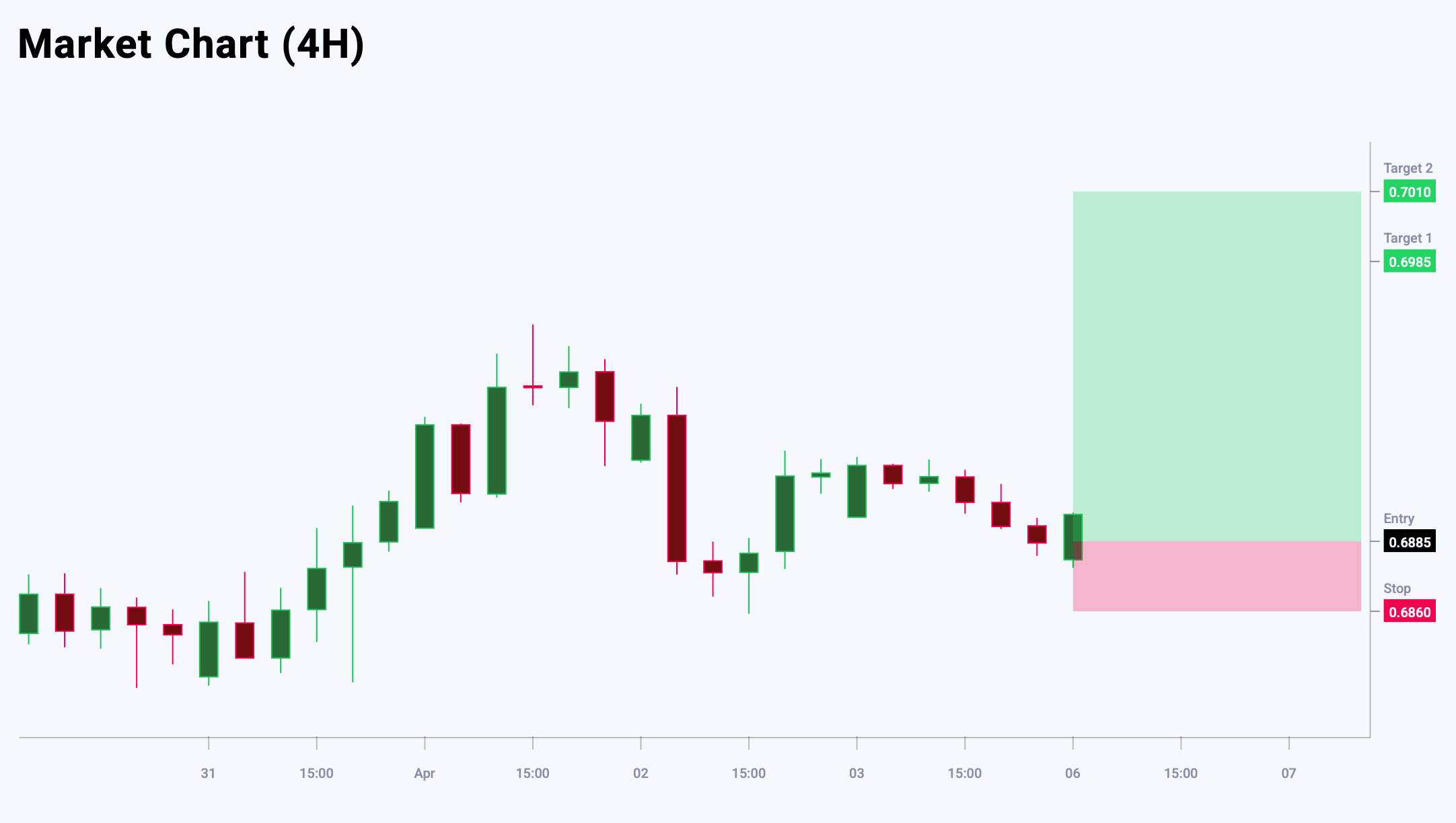 For EURGBP, bullish sentiment prevails – 52% vs 48%. The risk-to-reward ratio is above 1:3. The potential profit is 45 pips at the first take-profit level and 55 pips at the second, while potential losses are limited to 18 pips.