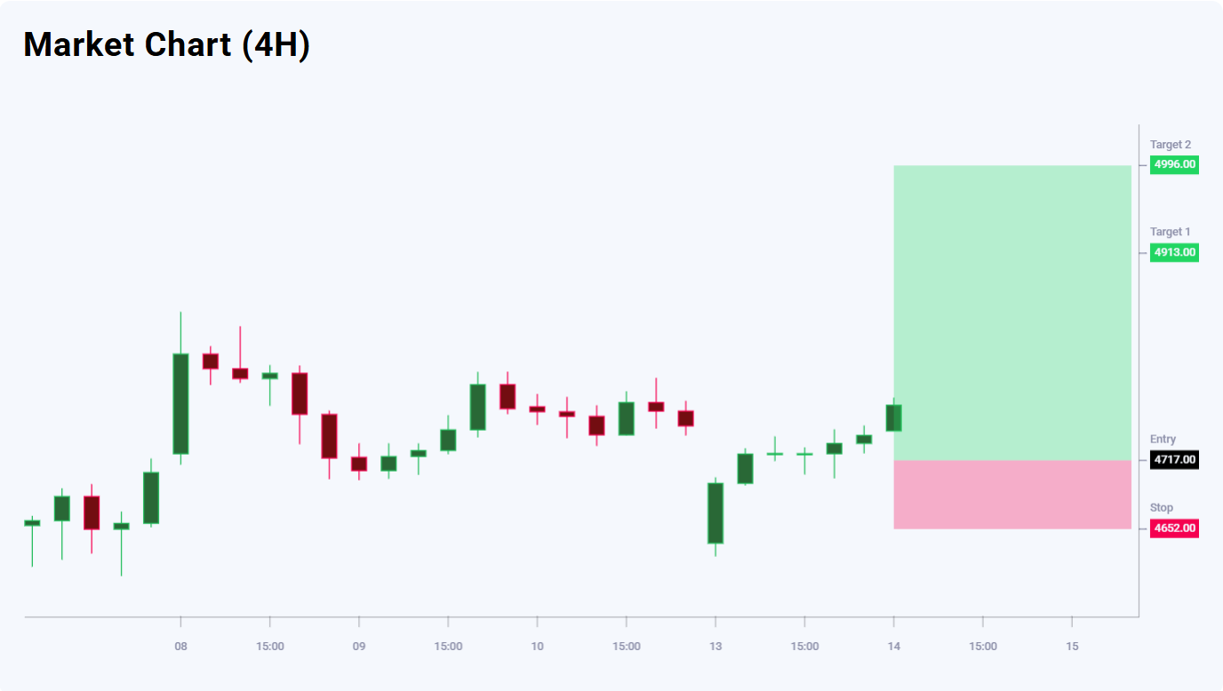 An additional benchmark for the market is the closed gap around 4,749.00, formed between 10 and 13 April. As a result, the baseline scenario suggests further upside, and the preferred strategy remains buying on pullbacks. Today’s XAUUSD trade idea suggests placing a pending Buy Limit order at 4,717.00.