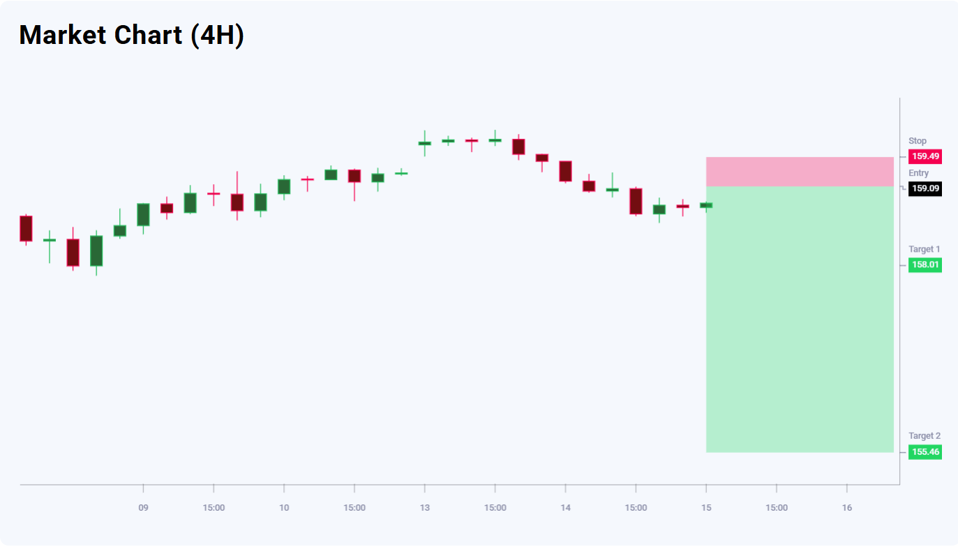 The news background for USDJPY favours sellers – 64% vs 36%. The trade appears attractive in terms of the risk-to-reward ratio. The first target at 158.01 offers a profit potential of 108 pips, while the second target at 155.46 increases the potential profit to 363 pips. The stop-loss at 159.49 limits the risk to 40 pips, corresponding to a risk-to-reward ratio of more than 1:2 for the first target and more than 1:9 for the second.