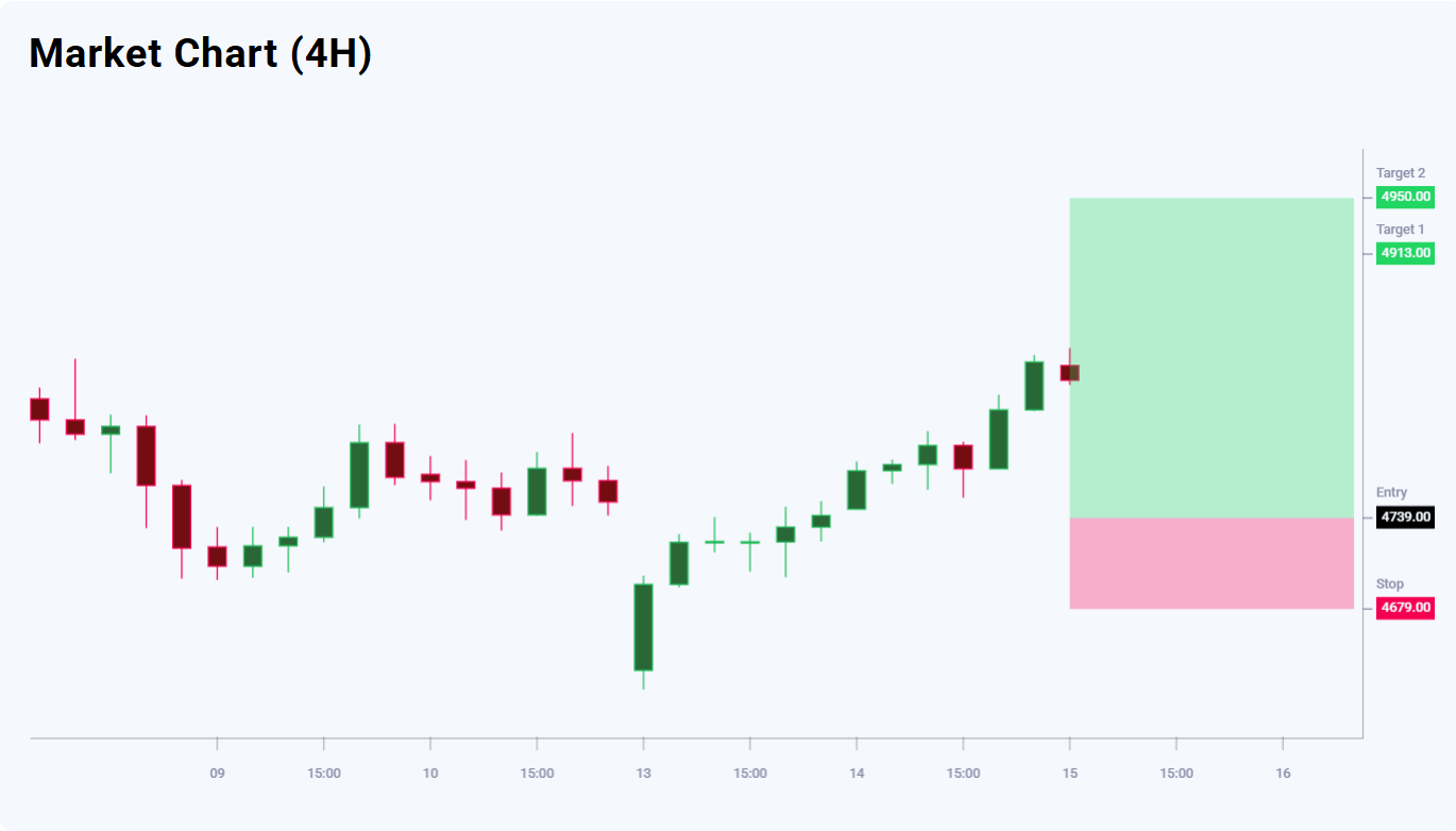 An additional reference point for the market is the confluence of Fibonacci lines around 4,913.00. As a result, the scenario suggests further upside, so the preferred strategy remains buying on dips. Today’s XAUUSD trade idea involves placing a pending Buy Limit order at 4,739.00.