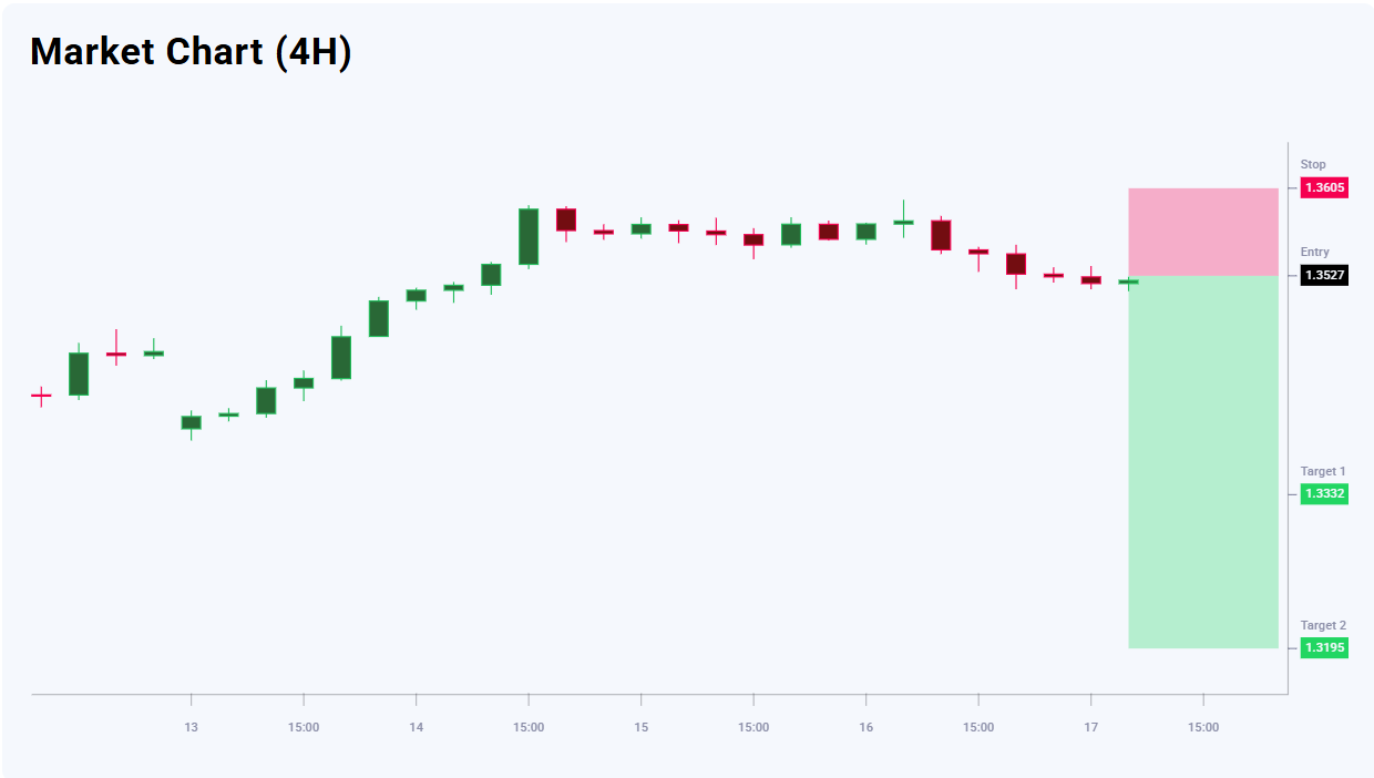 GBPUSD analysis shows that daily sentiment indicators are in overbought territory, increasing the likelihood of a short-term downward correction. An additional technical signal is the formation of an Evening Star reversal pattern at the top, signalling weakening bullish momentum. Against this backdrop, the preferred strategy is to sell on pullbacks, since the expected move lower is corrective but still offers attractive risk-to-reward opportunities. The current market structure allows for further decline after the failed attempt to extend the rally. Today’s GBPUSD trade idea suggests placing a pending Sell Limit order at 1.3527.