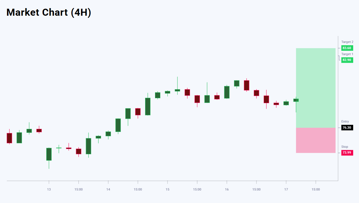 The news backdrop for XAGUSD shows a moderate bias in favour of sellers – 56% vs 44%. However, the technical picture still allows for the uptrend to resume after the correction. The trade looks moderately attractive in terms of the risk-to-reward ratio. The first target at 82.90 offers upside potential of 660 pips, while the second target at 83.60 increases the potential profit to 730 pips. The stop-loss at 73.99 limits the risk to 231 pips, resulting in a risk-to-reward ratio of 1:2.9 for the first target and 1:3.2 for the second.