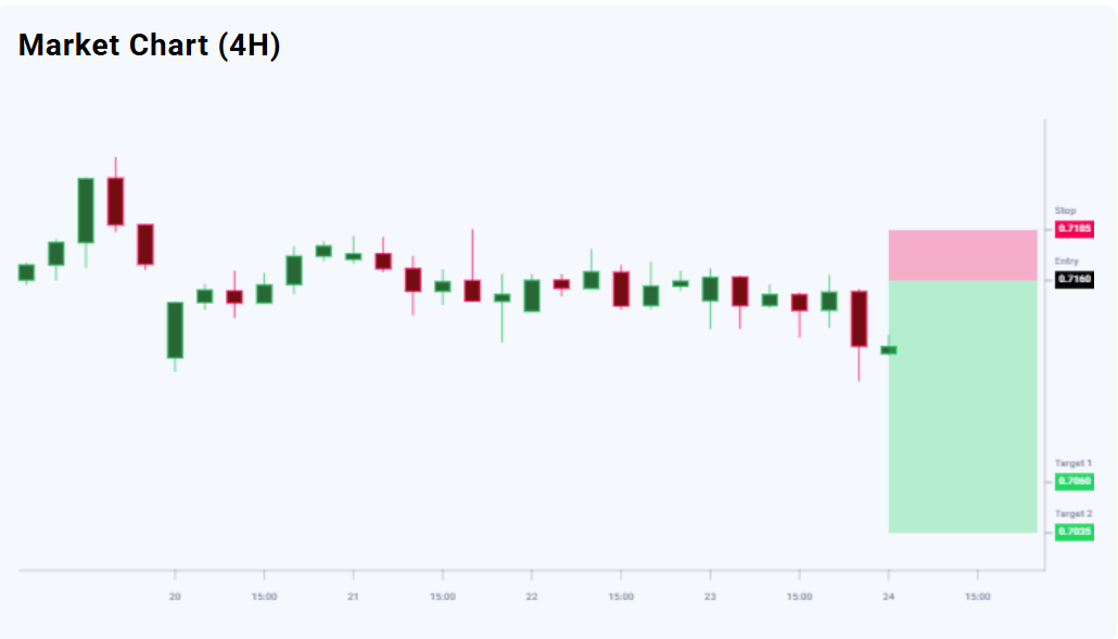 AUDUSD analysis shows that, despite bulls remaining in control, waning positive momentum indicates a possible reversal. Rallies are likely to be capped by yesterday’s high. Price action indicates that a top is forming. Therefore, the preferred strategy is to sell on upward pullbacks. Today’s trade idea for AUDUSD suggests placing a pending Sell Limit order at 0.7160.