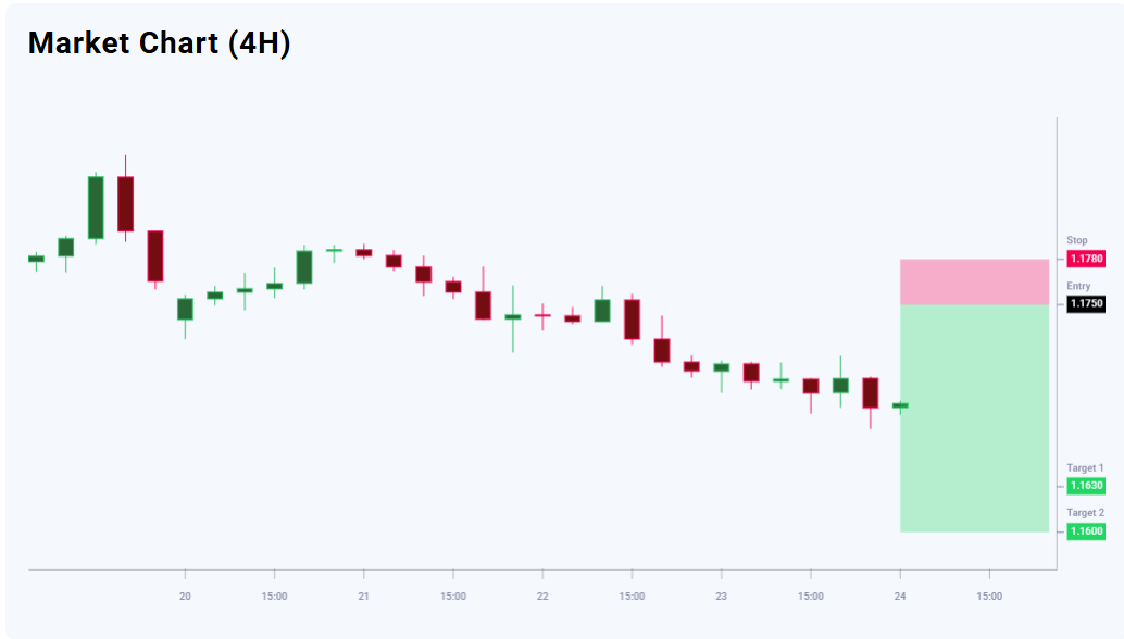 EURUSD analysis shows that the medium-term bias remains bearish. The short-term RSI is moving upwards, indicating a potential correction before the downtrend resumes. Placing a sell order at current levels would be unfavourable in terms of the risk-to-reward ratio. Therefore, the preferred strategy is to sell on upward pullbacks. Against this backdrop, the baseline scenario suggests selling. Today’s trade idea for EURUSD involves placing a pending Sell Limit order at 1.1750.