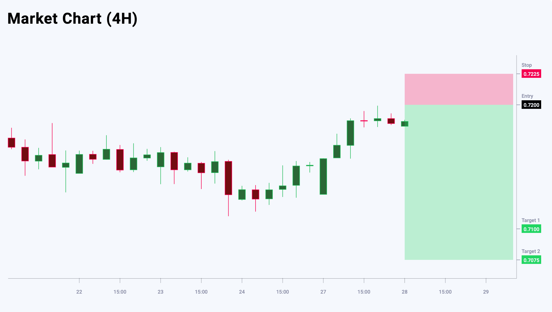 Buyers continue to maintain control of the AUDUSD pair, although weakening upward momentum suggests a reversal pattern is likely. In the short term, the pair could attempt to continue its upward trajectory, but the current price action is beginning to show signs of forming a local peak. Under these conditions, the preferred scenario becomes searching for selling opportunities on price rises. The key resistance level is concentrated at 0.7200, where increased selling pressure is expected. Today’s trade idea for AUDUSD suggests placing a pending Sell Limit order.