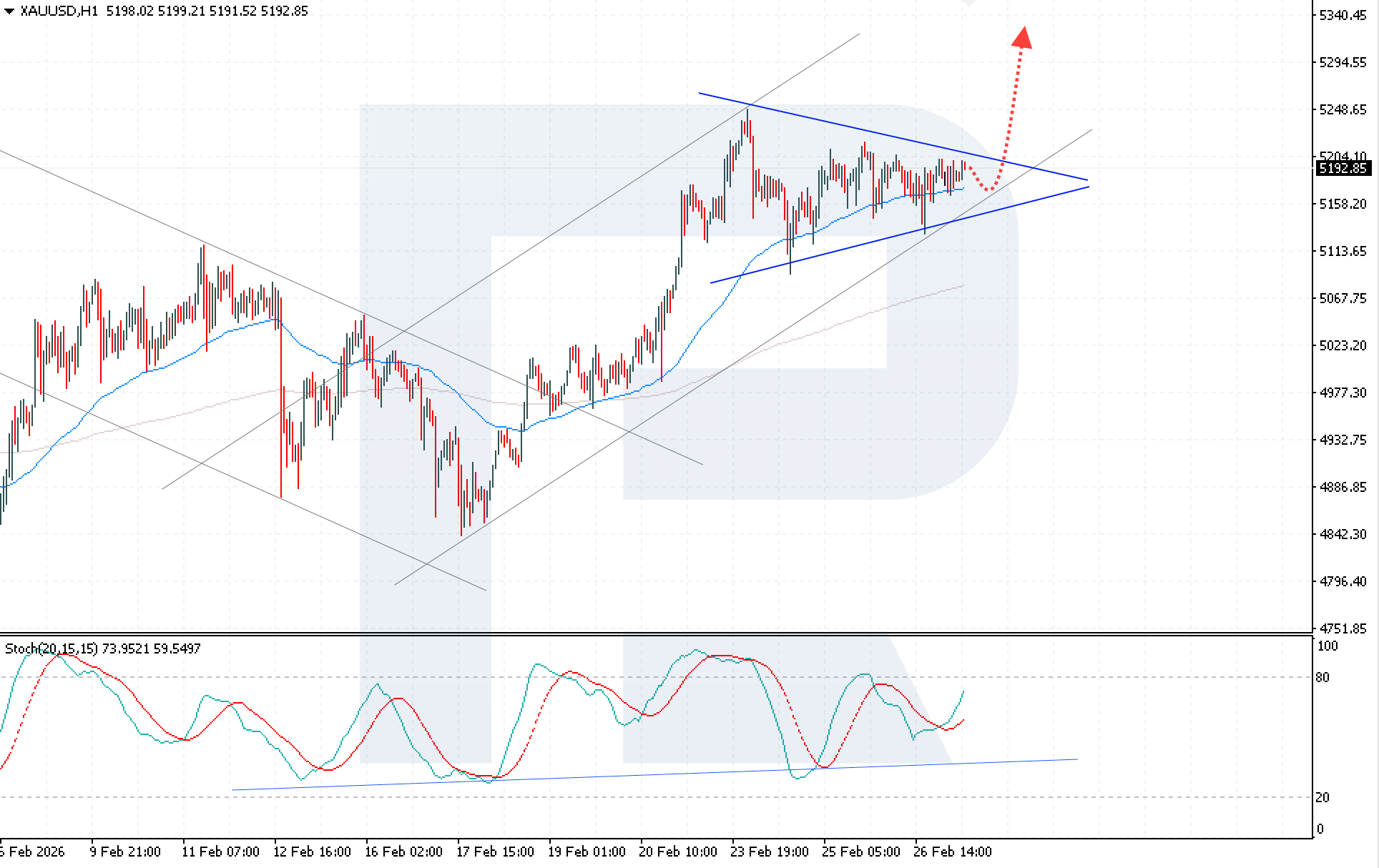 El pronóstico de XAUUSD para hoy sugiere un crecimiento continuo hacia 5,340 USD. El panorama técnico sigue favoreciendo a los compradores. El Oscilador Estocástico confirma el escenario alcista, con sus líneas de señal formando un cruce alcista e indicando un impulso sostenido. Una ruptura decisiva por encima del límite superior del patrón Triángulo y la consolidación por encima de 5,205 USD confirmarán el escenario principal. En este caso, el mercado recibirá una señal adicional de crecimiento sostenido, con potencial para moverse hasta la altura del patrón formado.