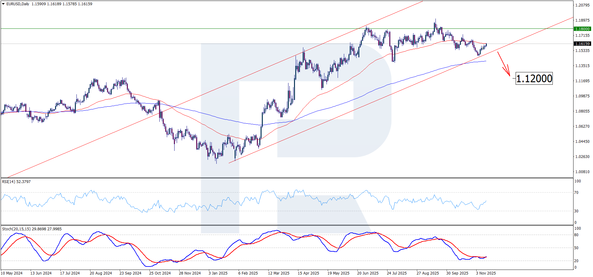 Análisis del gráfico diario (noviembre de 2025): en el marco temporal diario, la situación técnica de EURUSD ha mejorado notablemente en comparación con principios de 2025. La tendencia alcista que dominó la primera mitad de 2025 se transformó en una onda correctiva. Cabe destacar que el precio pone a prueba la Media Móvil Exponencial de 65 días (EMA-65) desde abajo hacia arriba, mientras que todavía cotiza por encima de la Media Móvil Exponencial de 200 días (EMA-200) a largo plazo, lo que señala una transición hacia un sentimiento de mercado alcista.