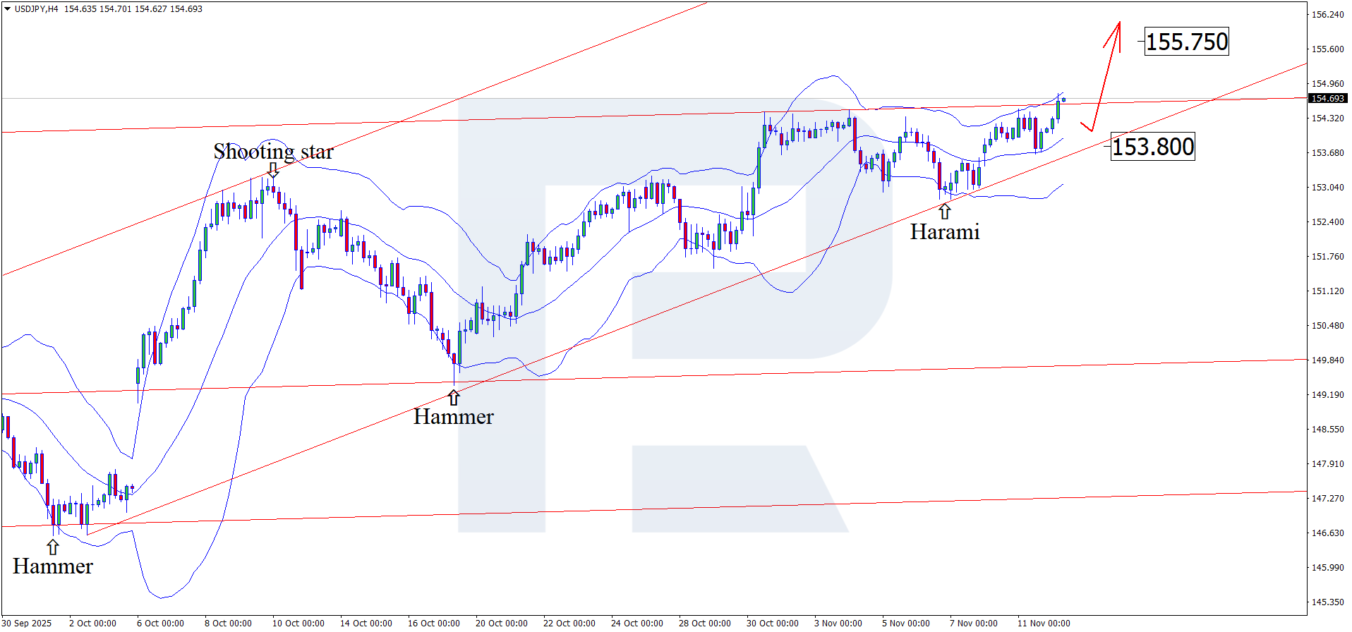 En el gráfico H4, el par USDJPY formó un patrón de reversión Harami cerca de la banda inferior de Bollinger y actualmente cotiza en torno a 154.60. El precio continúa su movimiento ascendente tras la señal del patrón, con un objetivo alcista en 155.75.