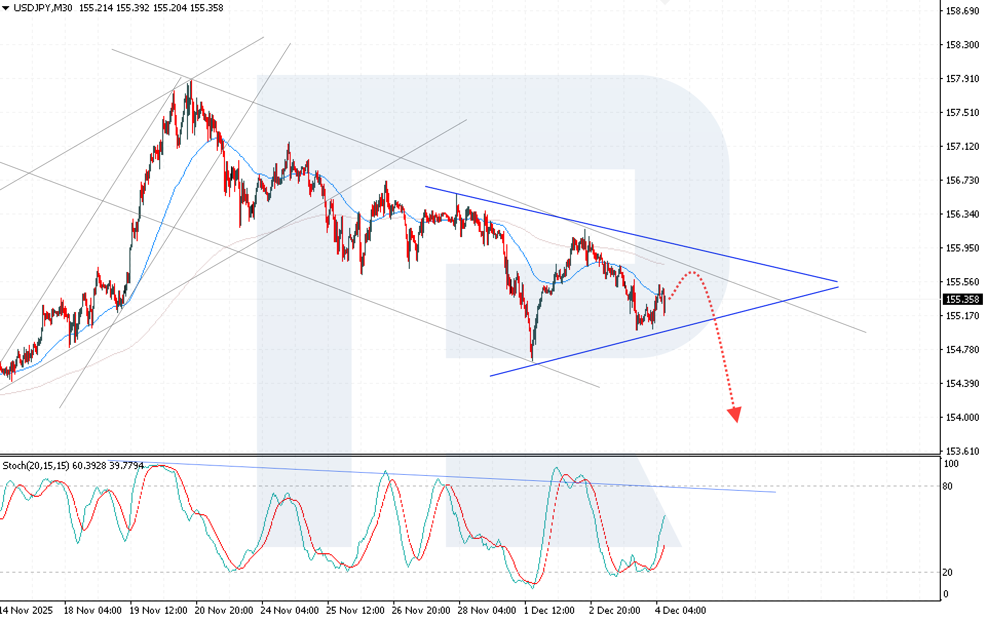 El pronóstico USDJPY sugiere una corrección alcista a corto plazo hacia 155.55. Esta zona actúa como resistencia clave dentro del Triángulo. Tras probar el nivel de 155.55, el par podría reanudar su movimiento descendente hacia 153.85. El oscilador Estocástico confirma la probabilidad del escenario bajista: sus líneas de señal han girado al alza desde la zona de sobreventa y se acercan a la línea de resistencia descendente.