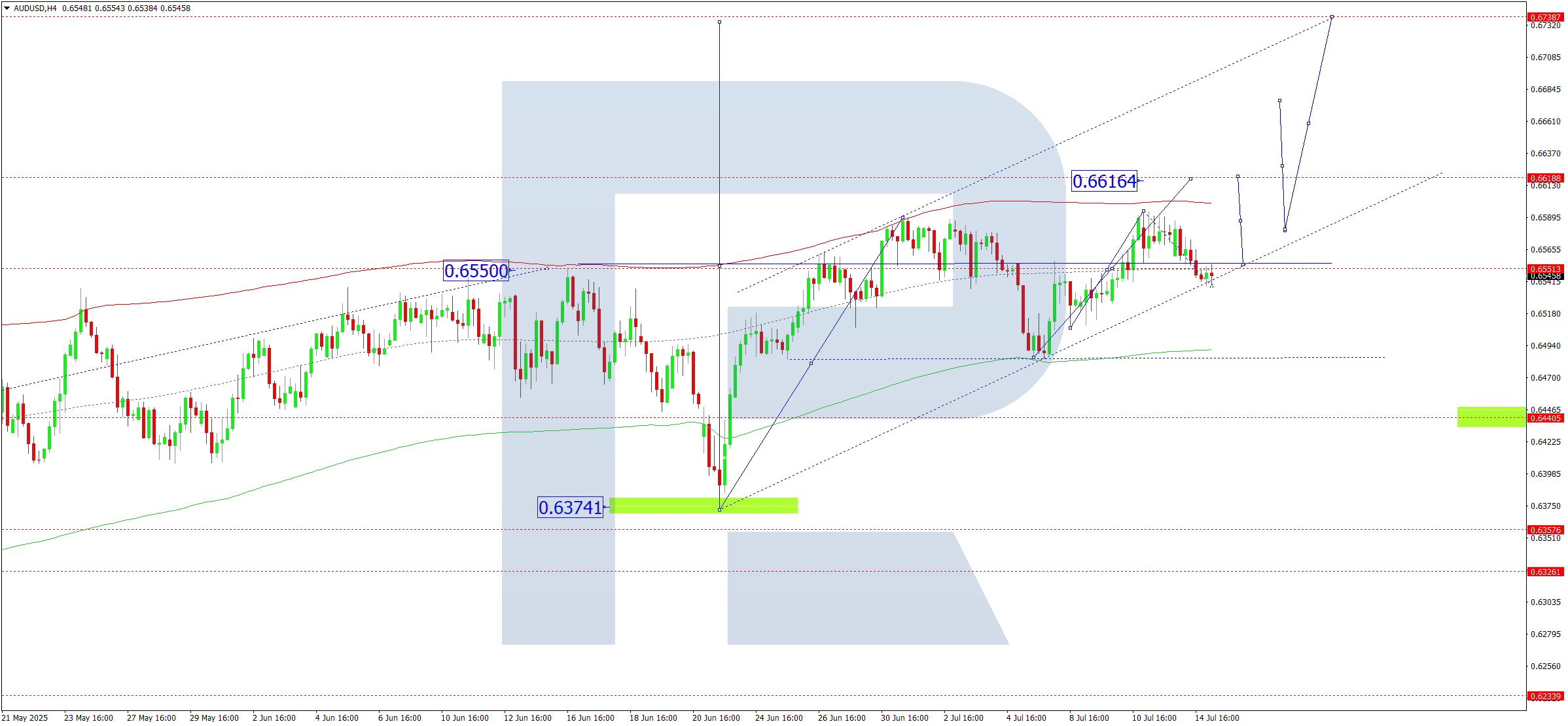 En el gráfico H4 de AUDUSD, el mercado completó una corrección hacia 0.6540. Hoy, 15 de julio de 2025, esperamos una onda de crecimiento hacia 0.6616 como objetivo local. Una vez alcanzado este nivel, podría seguir una corrección hacia 0.6550.