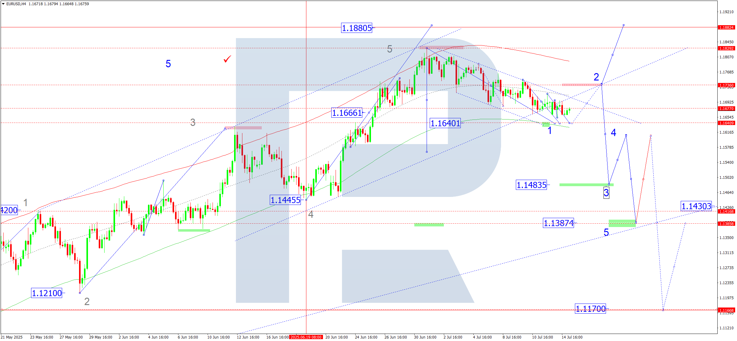 En el gráfico H4 de EURUSD, el mercado continúa desarrollando un estrecho rango de consolidación alrededor de 1.1677. Hoy, 15 de julio de 2025, es posible la continuación de la onda bajista hacia 1.1640. Al alcanzar este nivel, podría seguir una fase de crecimiento hacia 1.1737.