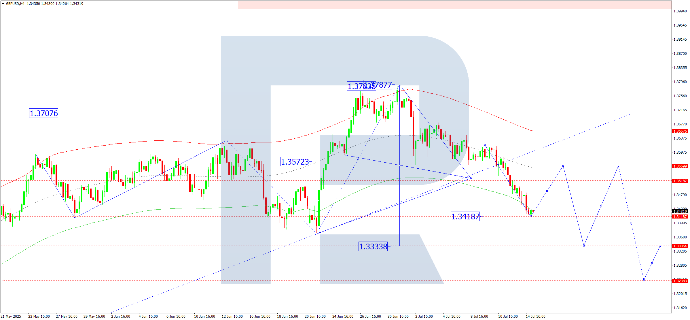 En el gráfico H4 de GBPUSD, el mercado completó una onda bajista hacia 1.3418. Hoy, 15 de julio de 2025, se espera la formación de un rango de consolidación alrededor de este nivel. Si el precio rompe al alza, es posible una corrección hacia 1.3560. Si rompe a la baja, la tendencia podría continuar hacia 1.3333.