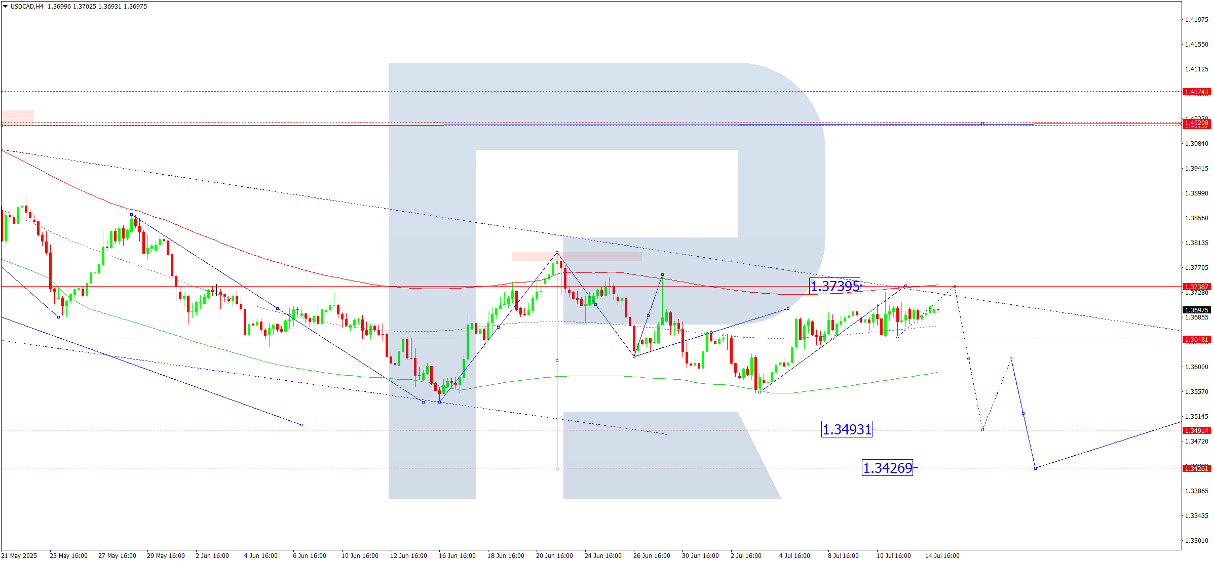 En el gráfico H4 de USDCAD, el mercado continúa su onda de crecimiento hacia 1.3737. Hoy, 15 de julio de 2025, esperamos que el precio alcance este objetivo y luego inicie una onda bajista hacia 1.3640. Si el precio rompe por debajo de este nivel, la tendencia podría continuar hacia 1.3494.