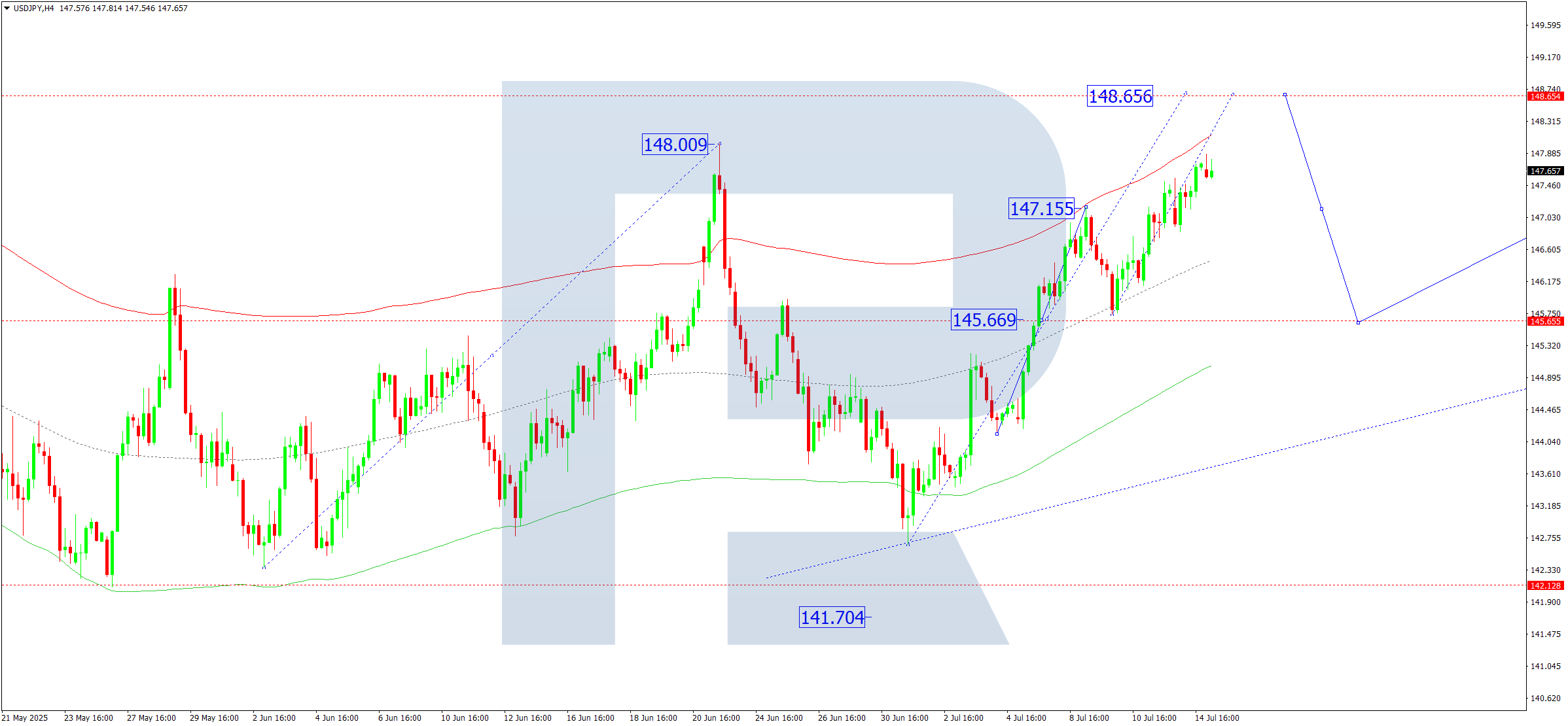 Técnicamente, este escenario para USDJPY está respaldado por la estructura de ondas de Elliott y la matriz de ondas de crecimiento con un centro de rotación en 145.66. Este sigue siendo clave en la estructura de esta onda. Actualmente, el mercado está formando una estructura de crecimiento hacia el límite superior del Price Envelope en 148.65. Posteriormente, es posible un descenso hacia su línea central en 147.17.