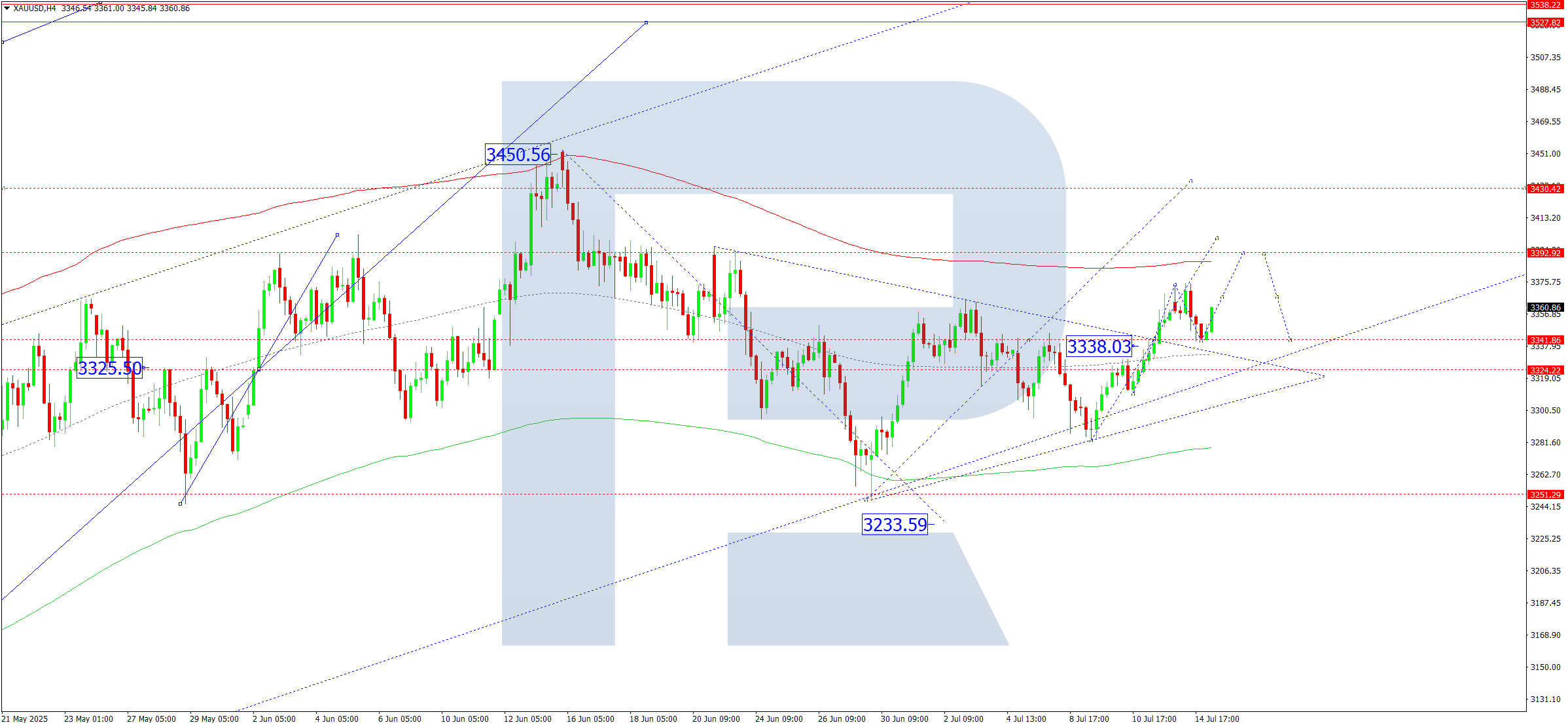En el gráfico H4 de XAUUSD, el mercado completó una corrección en 3,340 y comenzó a desarrollar una nueva onda de crecimiento. Hoy, 15 de julio de 2025, se espera una fase de crecimiento hacia 3,370. Posteriormente, podría formarse un rango de consolidación alrededor de este nivel. Es relevante considerar una ruptura alcista hacia 3,400 como objetivo local.