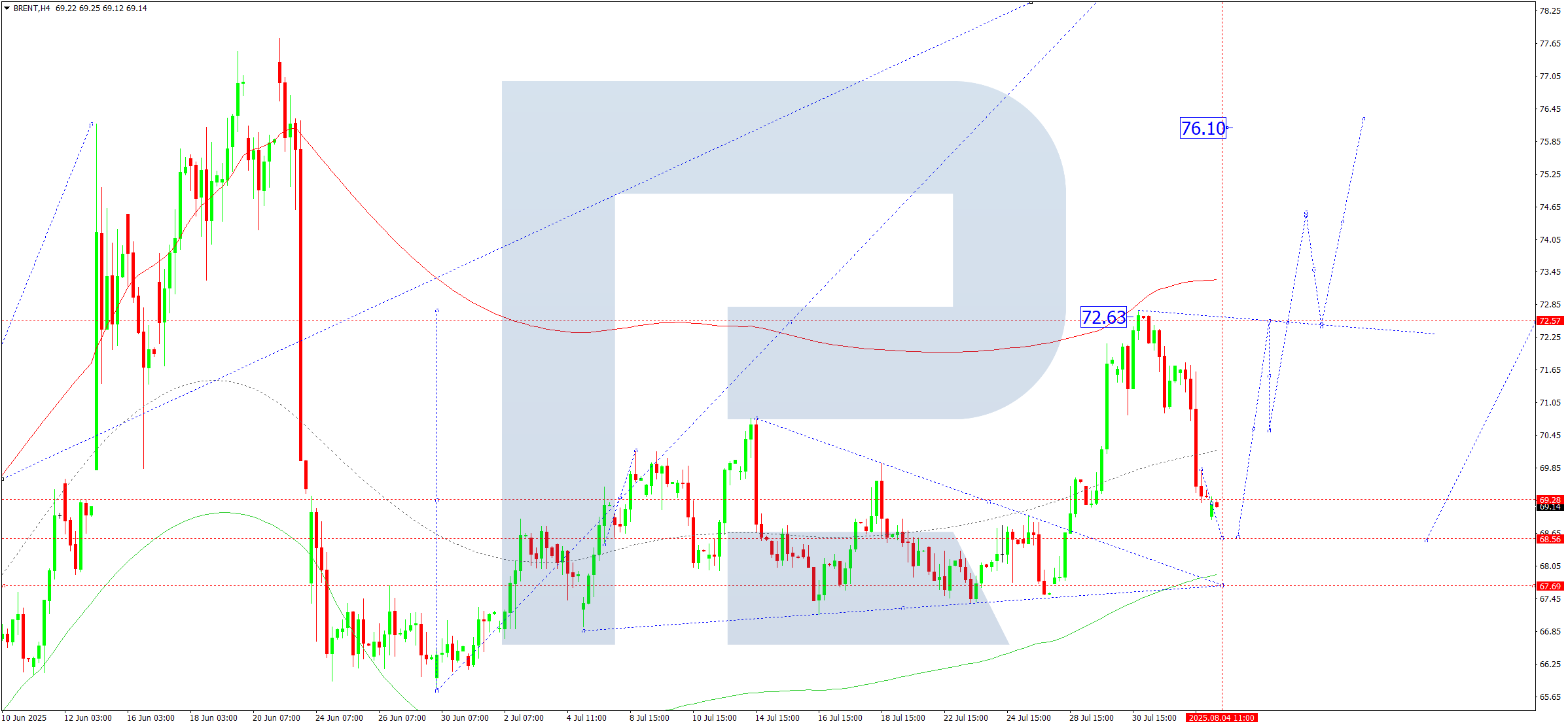 En el gráfico H4 del crudo Brent, el mercado formó un rango de consolidación alrededor de 71.80 y continuó una corrección bajista hacia 68.55. Hoy, 4 de agosto de 2025, se espera que el precio complete la corrección e inicie la formación de una estructura de crecimiento hacia 72.62. Una ruptura por encima de este nivel abre el potencial para una continuación de la tendencia hacia 76.10 como objetivo local.