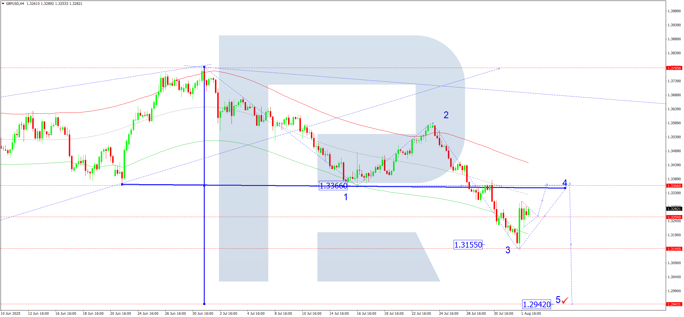 En el gráfico H4 de GBPUSD, el mercado completó una onda bajista hacia 1.3141, un objetivo local. Hoy, 4 de agosto de 2025, es posible una corrección hacia 1.3366 (prueba desde abajo), seguida de una caída hacia 1.2942.