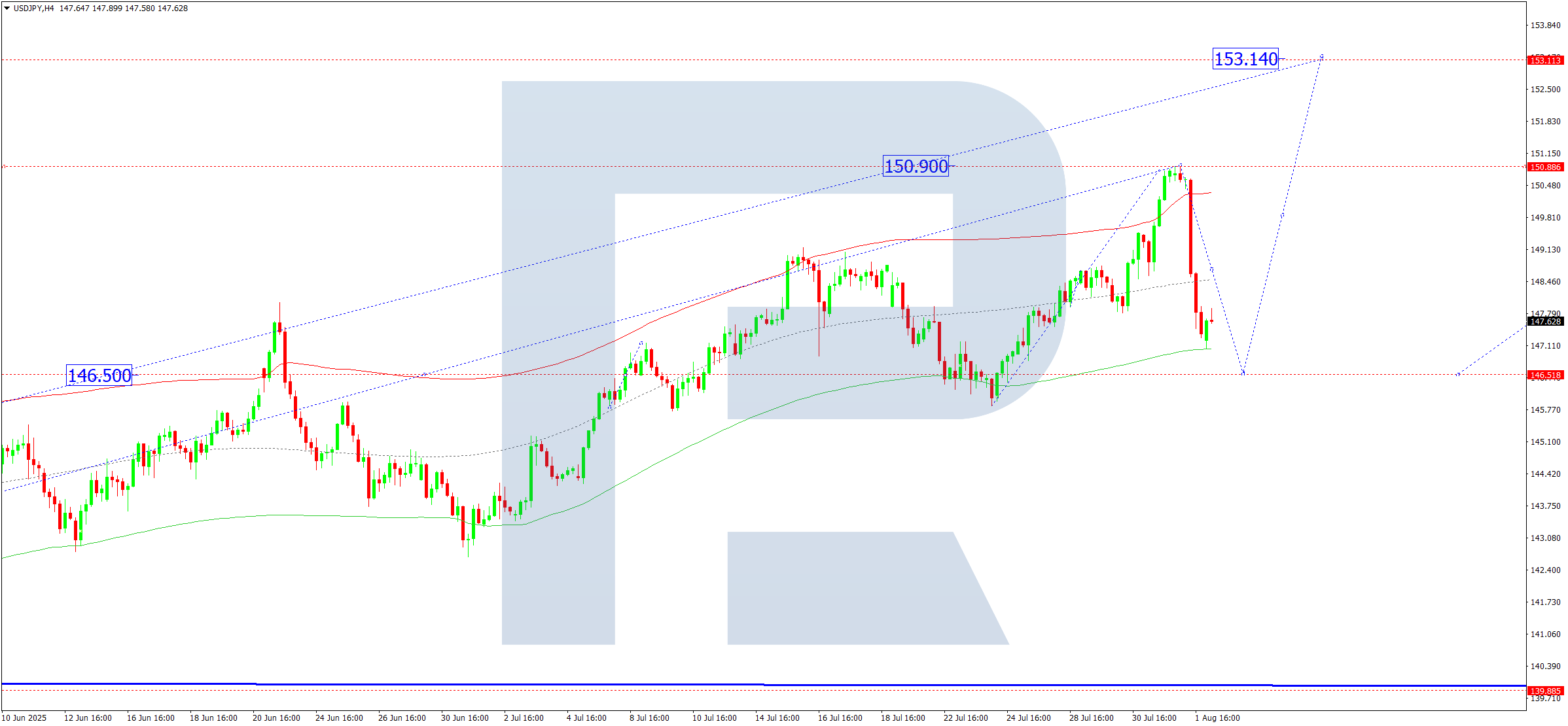 En el gráfico H4 de USDJPY, el mercado continúa desarrollando una corrección hacia 146.52. Hoy, 4 de agosto de 2025, es probable que se alcance este nivel objetivo. Luego se espera una onda de crecimiento hacia 149.80, con posibilidad de desarrollo de una estructura ascendente hasta 153.14.