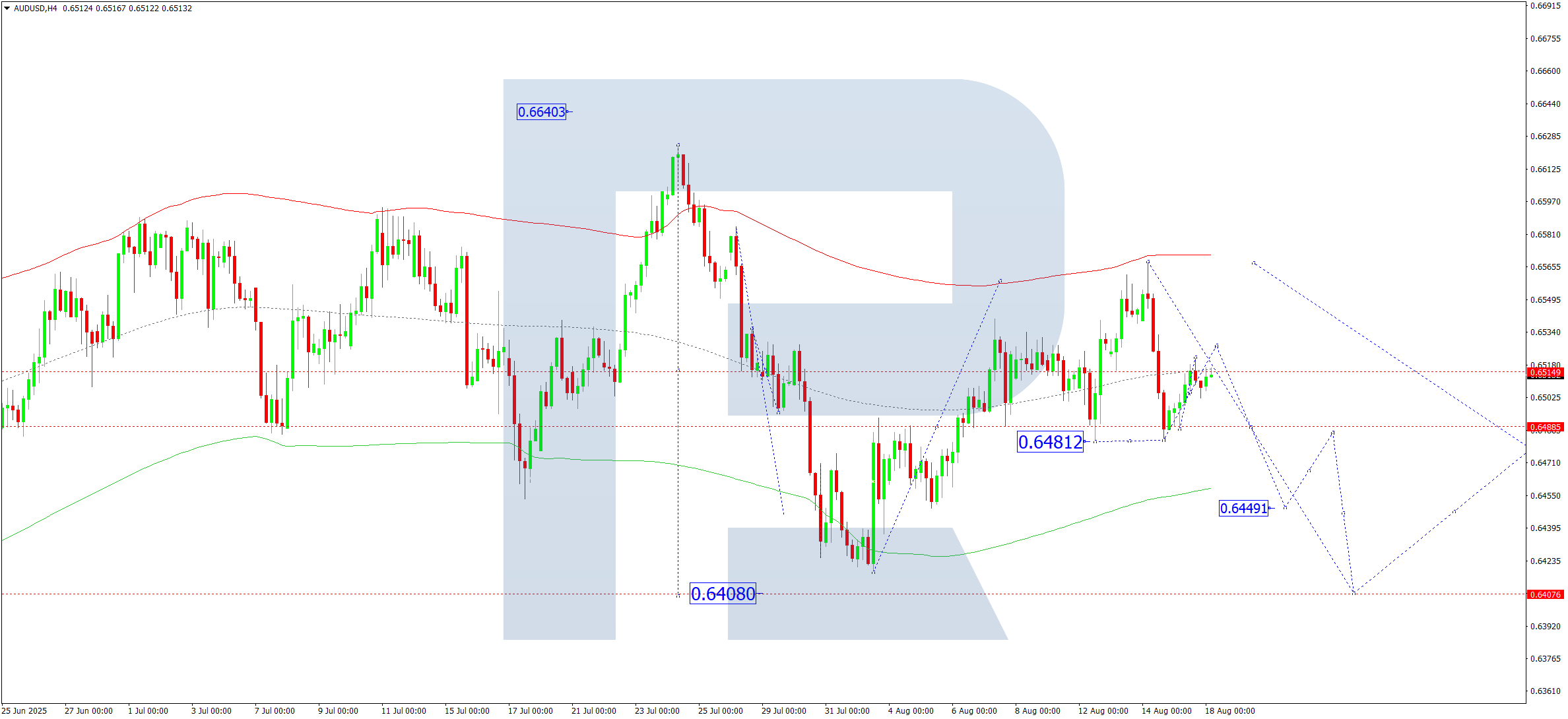 En el gráfico H4 del AUDUSD, el mercado continúa su corrección hacia 0.6525. Hoy, 18 de agosto de 2025, se espera que este nivel objetivo sea alcanzado. Posteriormente, podría comenzar una onda bajista hacia 0.6480. Una ruptura por debajo de este nivel podría abrir el potencial para una continuación hacia 0.6408, el primer objetivo.