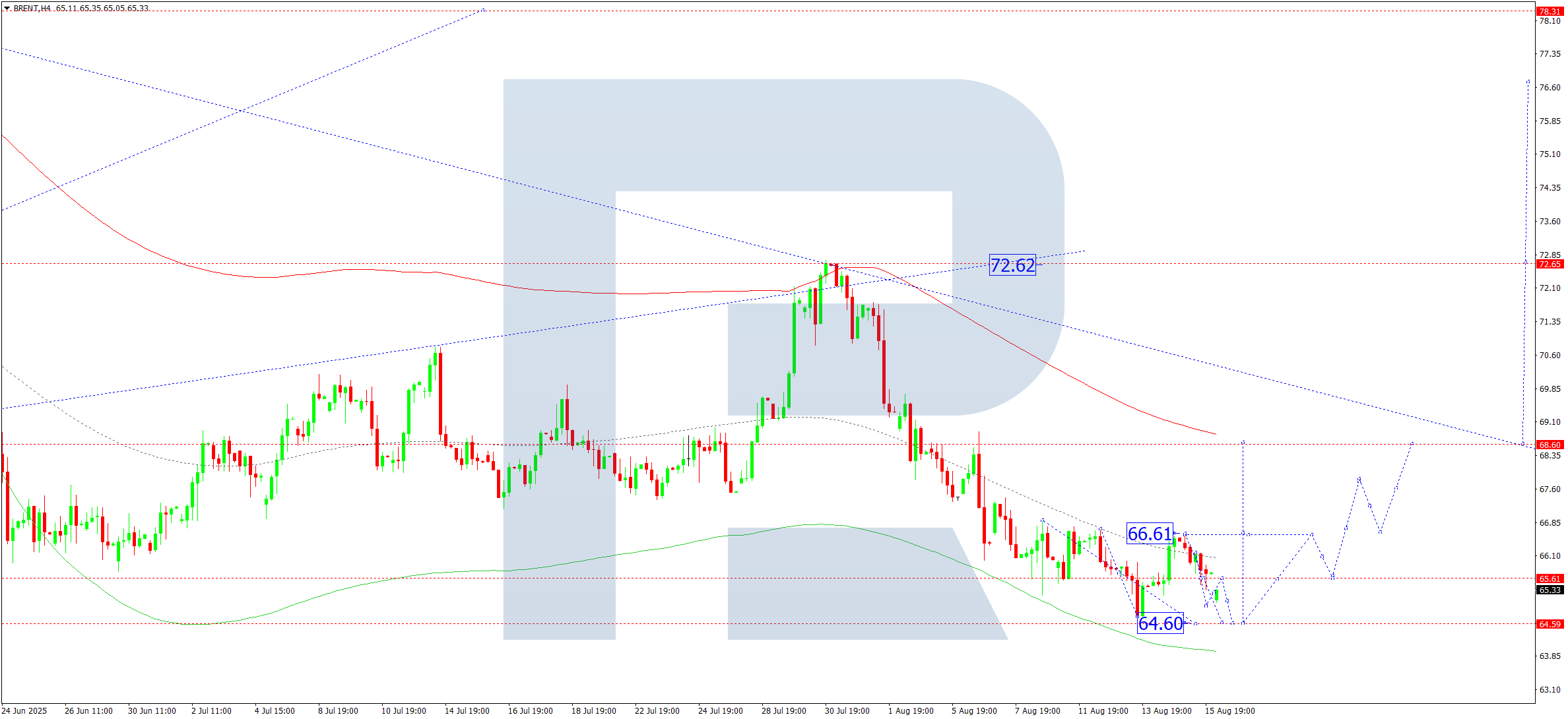 En el gráfico H4 del crudo Brent, el mercado continúa desarrollando un rango de consolidación alrededor de 65.60. Hoy, 18 de agosto de 2025, no se descarta una extensión del rango hacia abajo hasta 64.60. Posteriormente, se espera un ascenso hacia 66.60. Una ruptura por encima de este nivel podría marcar el inicio de una onda de crecimiento hacia 68.60, con la tendencia potencialmente continuando hasta 72.60.
