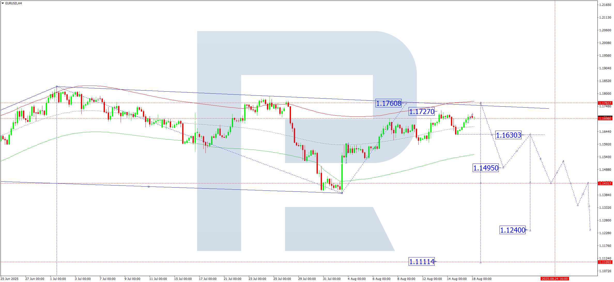 En el gráfico H4 del EURUSD, el mercado ejecutó otra estructura de crecimiento hacia 1.1698. Prácticamente, el potencial de esta estructura alcista, vista como una corrección, ya se ha cumplido. Hoy, 18 de agosto de 2025, podría desarrollarse un rango de consolidación compacto alrededor de este nivel. No se descarta una ruptura alcista como escenario alternativo, que extendería la corrección hacia 1.1760. El escenario principal sigue siendo una ruptura bajista hacia 1.1630. Posteriormente, es posible otro tramo de crecimiento hasta 1.1690, seguido de una caída hacia 1.1430, con perspectivas de una onda que se extienda hasta 1.1240 y 1.1111.