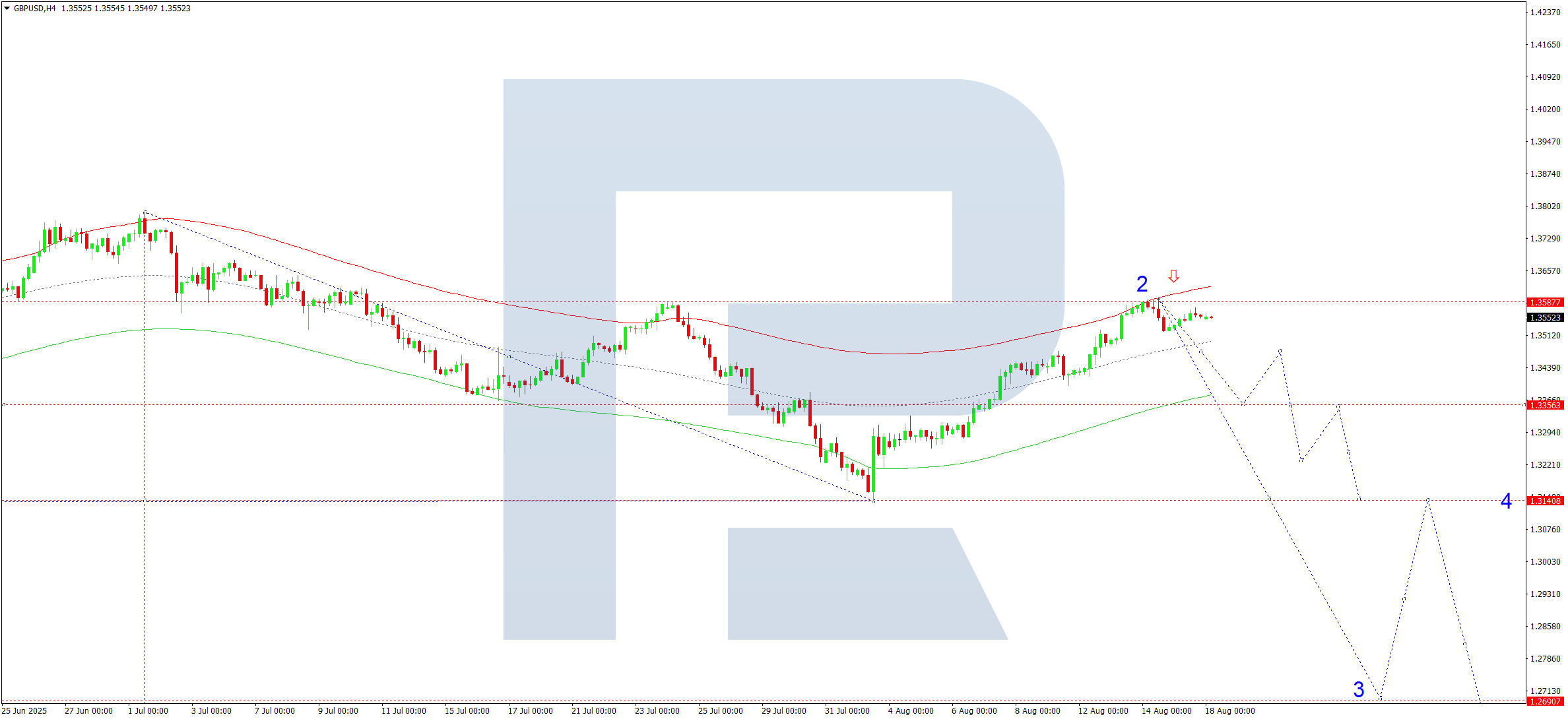 En el gráfico H4 del GBPUSD, el mercado completó una estructura correctiva hacia 1.3590. Hoy, 18 de agosto de 2025, se espera la formación de un rango de consolidación por debajo de este nivel. Una ruptura bajista podría señalar el inicio de una onda hacia 1.3355, con el primer objetivo en la estructura en 1.3140.