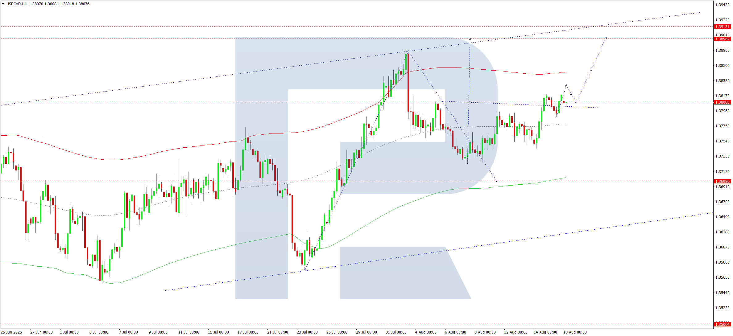 En el gráfico H4 del USDCAD, el mercado corrigió hasta 1.3750. El 18 de agosto de 2025, se ejecutó un impulso alcista hasta 1.3800. Actualmente, se está formando un rango de consolidación alrededor de este nivel. Una ruptura alcista podría llevar a una continuación hacia 1.3890. Si la ruptura es bajista, sería posible una nueva estructura hacia 1.3700, seguida de un crecimiento hacia 1.3890 como objetivo local.