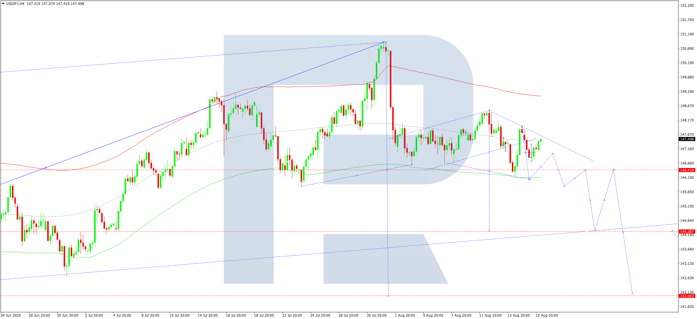 En el gráfico H4 del USDJPY, el mercado continúa formando un estrecho rango de consolidación alrededor de 147.35. Hoy, 18 de agosto de 2025, se espera una caída hacia el límite inferior en 146.40. Una ruptura por debajo podría abrir el potencial para una onda hacia 144.26 como objetivo local.