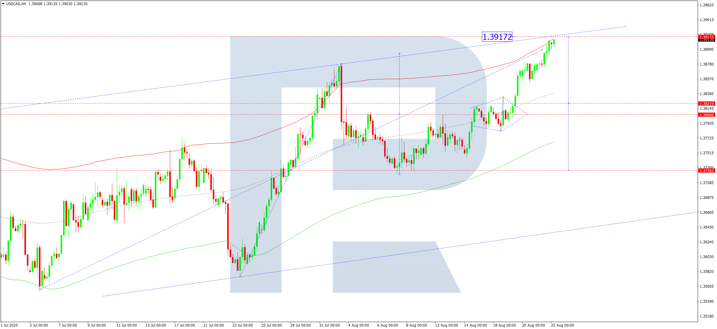 Técnicamente, la estructura de ondas de Elliott y la matriz de ondas ascendentes con un pivote en 1.3727 confirman este como el escenario principal para el USDCAD. Actualmente, el mercado ha completado una onda de crecimiento hacia el límite superior del Price Envelope en 1.3900.