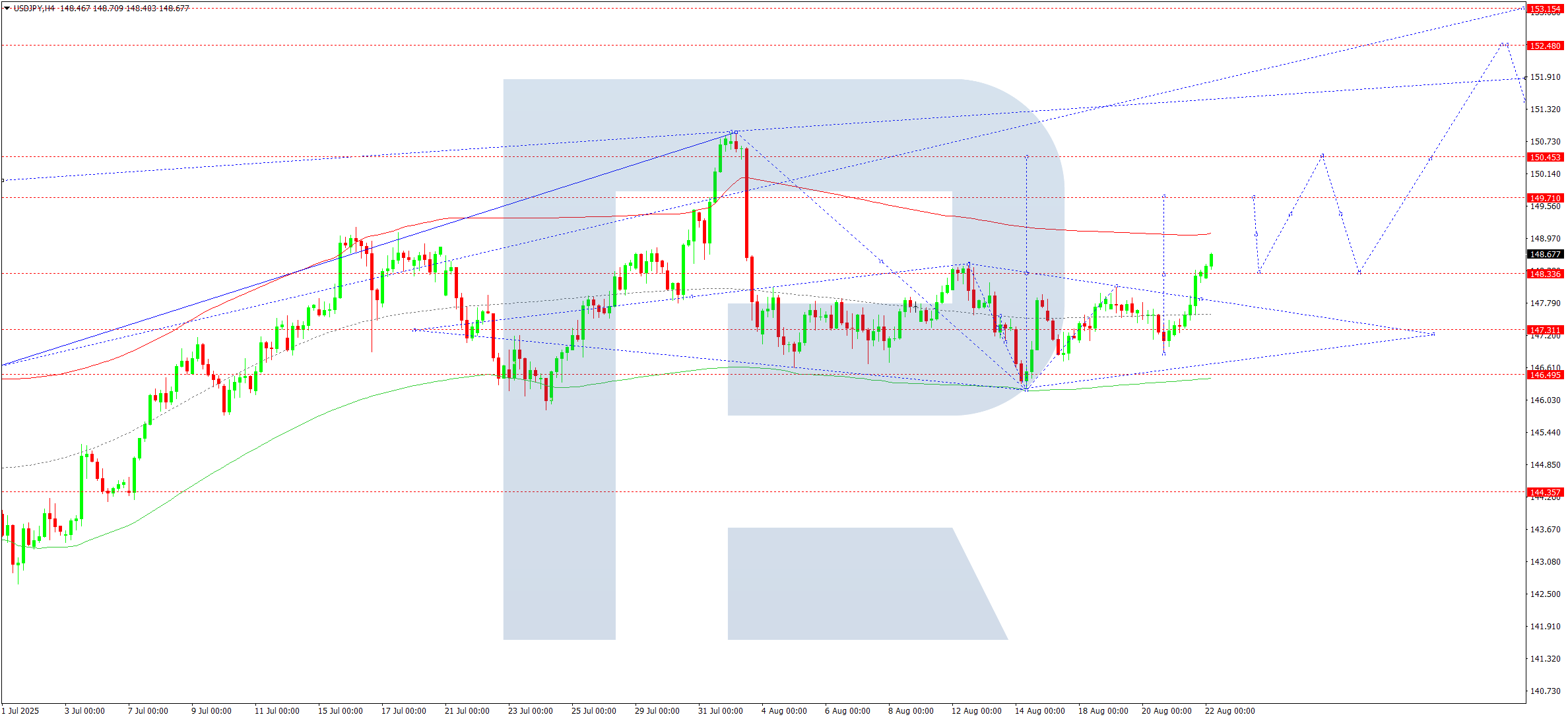 En el gráfico H4 del USDJPY, el mercado rompió por encima de 147.80, saliendo prácticamente del rango de consolidación hacia arriba. Hoy, 22 de agosto de 2025, se espera que el par suba hasta 149.70, un objetivo local. Tras alcanzar este nivel, es posible una corrección hacia 148.33 (prueba desde arriba). Después de eso, podría comenzar la siguiente onda ascendente hacia 150.45.