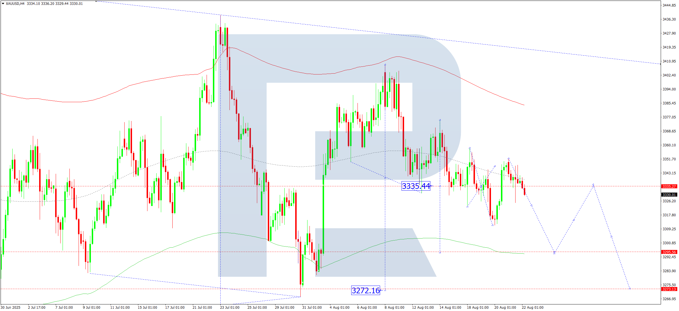 En el gráfico H4 del XAUUSD, el mercado continúa formando un rango de consolidación alrededor de 3,335. Hoy, 22 de agosto de 2025, es posible un descenso hacia el objetivo de 3,295, seguido de una corrección hacia 3,330 (prueba desde abajo), y luego otra caída hacia 3,272.