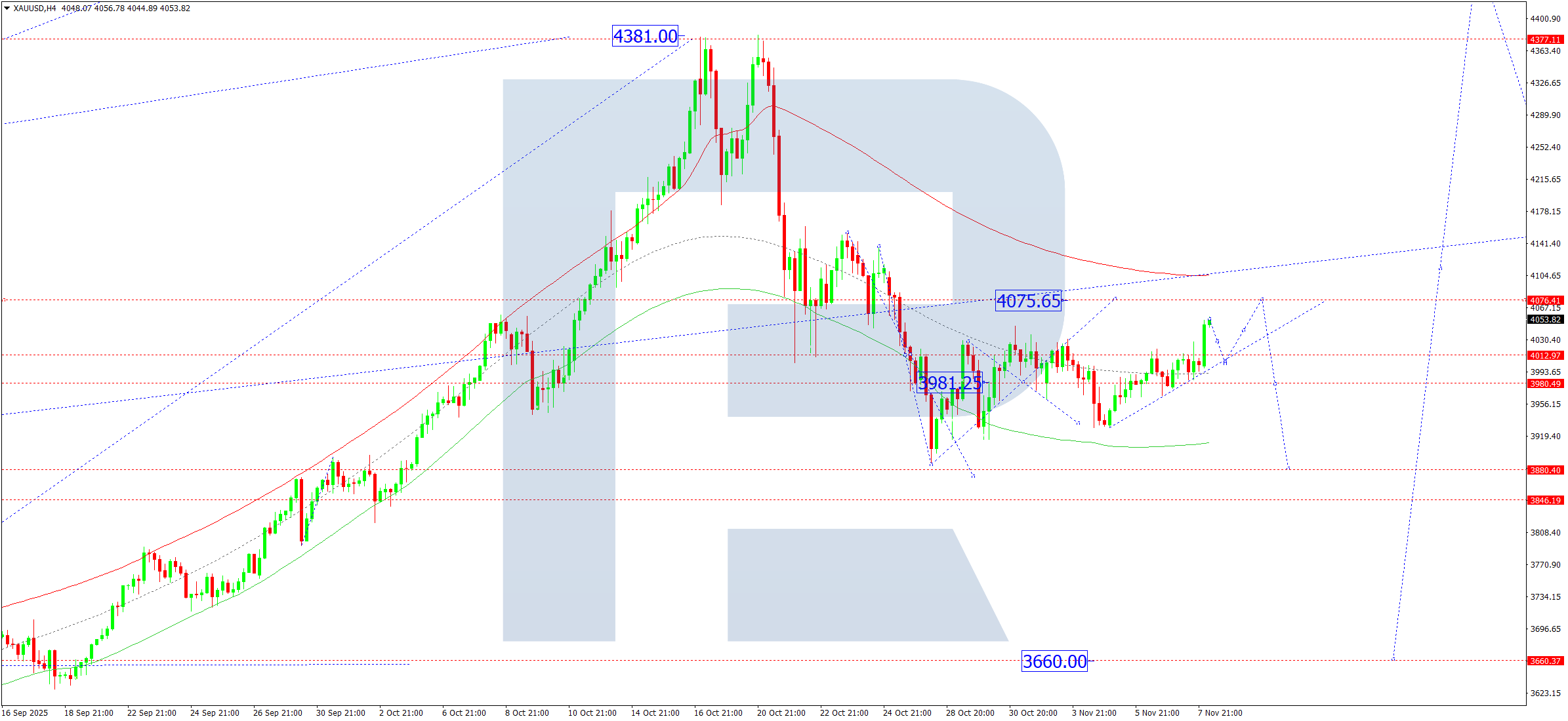 Este escenario está confirmado por la estructura de ondas de Elliott y la matriz de la onda ascendente con un punto de pivote en 3,660, que actúa como un elemento clave en la estructura de ondas del XAUUSD. Actualmente, el mercado está formando un movimiento correctivo hacia el límite inferior del Price Envelope en 3,880, seguido de un movimiento ascendente hacia su línea central en 4,020.