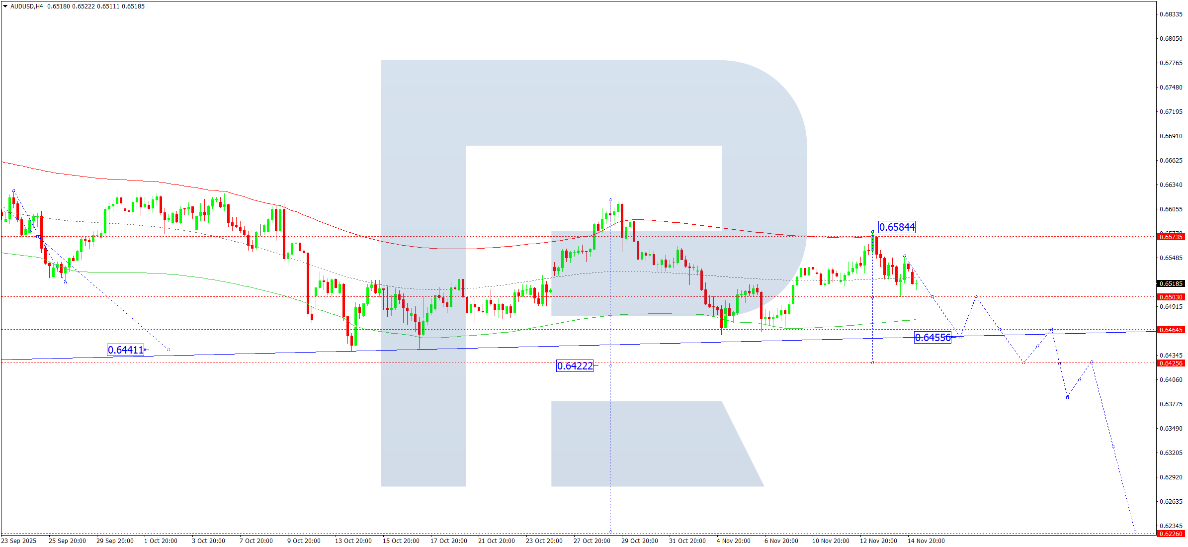 En el gráfico H4 del AUDUSD, el mercado completó una onda descendente hacia 0.6503 y una corrección hacia 0.6549. El 17 de noviembre de 2025, el pronóstico incluye una onda descendente hacia 0.6500. Una ruptura por debajo de este nivel abriría el camino para una onda descendente hacia 0.6455, con la tendencia potencialmente extendiéndose hacia 0.6422 como objetivo local estimado.
