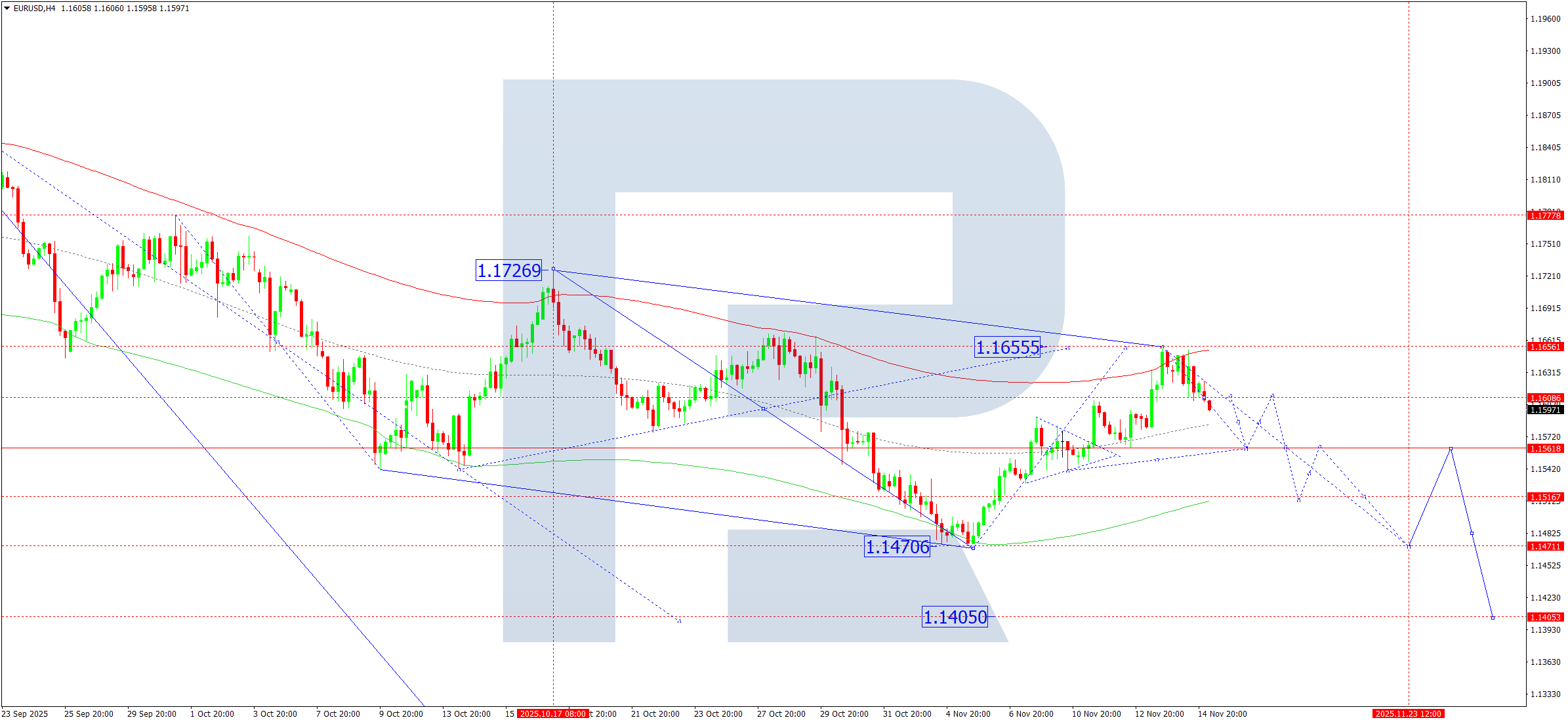 En el gráfico H4 del USDJPY, el mercado completó una corrección hacia 153.62 y continúa formando una onda ascendente hacia 155.15. El 17 de noviembre de 2025, el precio podría alcanzar este nivel objetivo y luego iniciar una corrección hacia 153.00. Posteriormente, podría comenzar una nueva onda ascendente con objetivo en 155.70 como meta local.