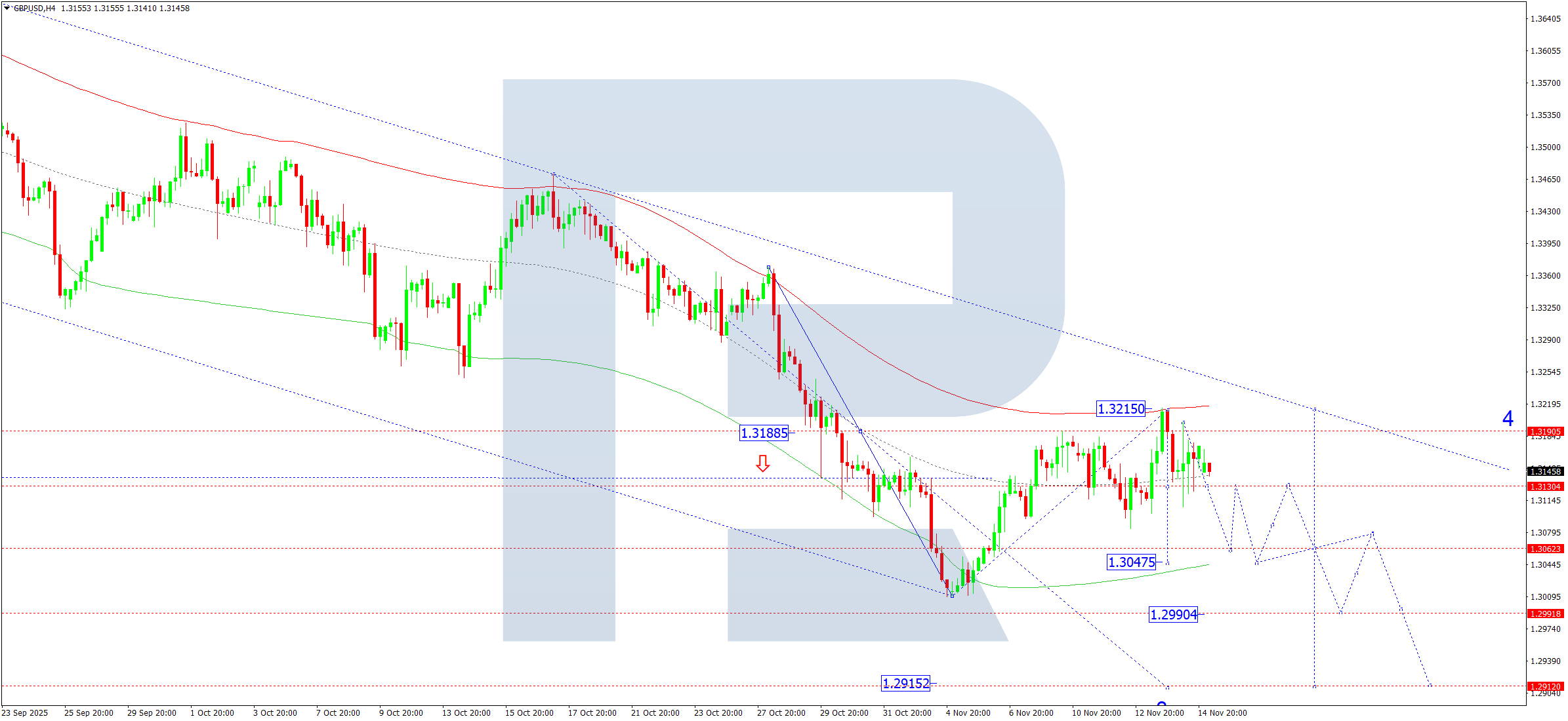En el gráfico H4 del GBPUSD, el mercado completó un impulso descendente hacia 1.3107. El 17 de noviembre de 2025, el mercado formó una corrección hacia 1.3190. Posteriormente, el escenario incluye un nuevo impulso bajista hacia 1.3126. Una ruptura por debajo de este nivel abriría el potencial para la continuación de la onda hacia 1.3047, con posibilidad de extender la tendencia hacia 1.2915.
