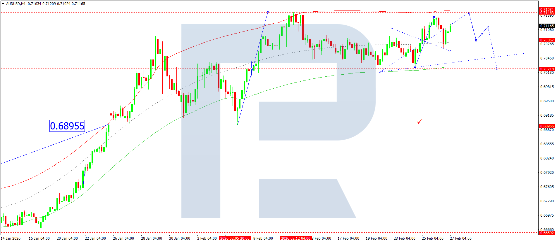 En el gráfico H4 del par AUDUSD, el mercado rompió por encima de 0.7111 y continúa la onda de crecimiento hacia 0.7460. Hoy, 27 de febrero de 2026, se espera el desarrollo de un rango de consolidación alrededor de 0.7125. En caso de una ruptura al alza, se abrirá el potencial de crecimiento hacia 0.7150. Se espera que una ruptura a la baja conduzca a una onda hacia 0.7020. Después, se considerará la probabilidad de que se desarrolle un rango de consolidación alrededor de este nivel.