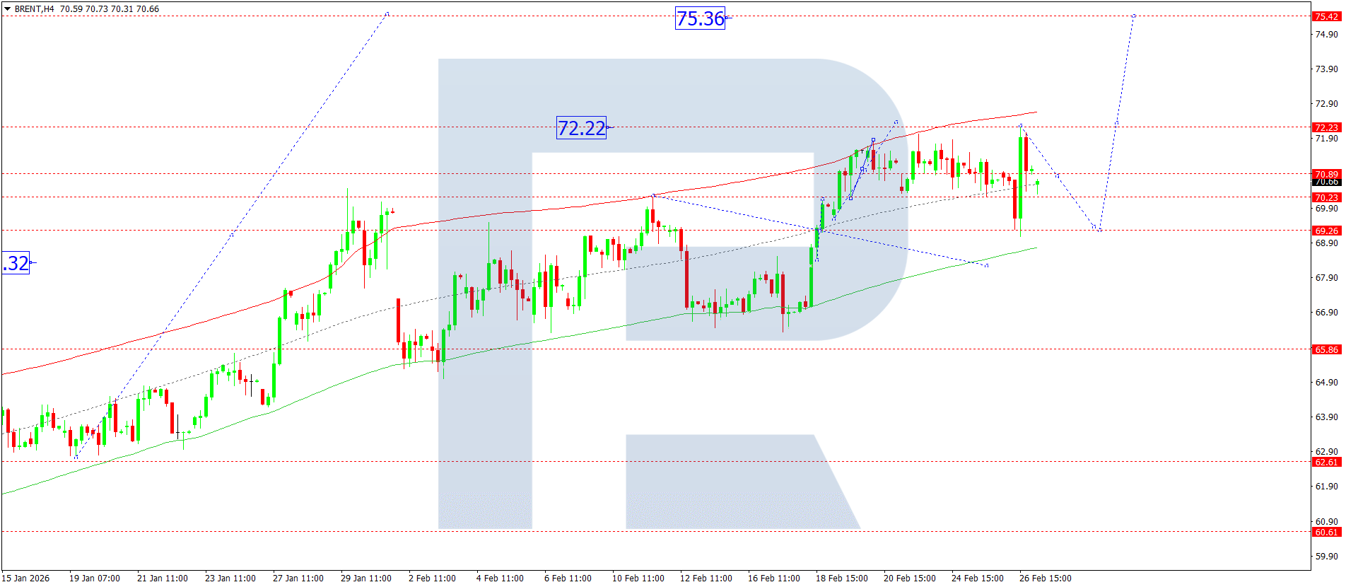 En el gráfico H4 del crudo Brent, el mercado completó una onda de crecimiento hasta 72.22. Hoy, 27 de febrero de 2026, se espera un tramo de caída hasta 69.29. Más adelante, se considerará el inicio de una onda de crecimiento hacia 75.36.
